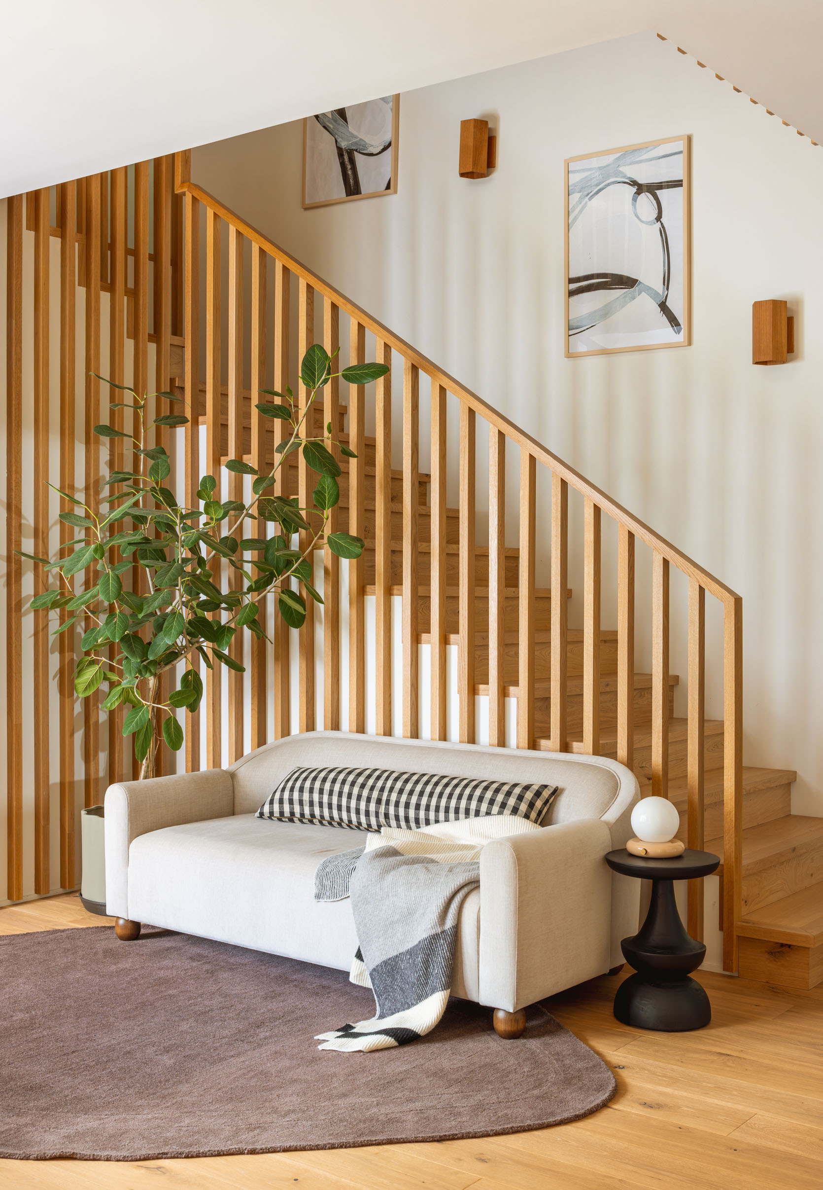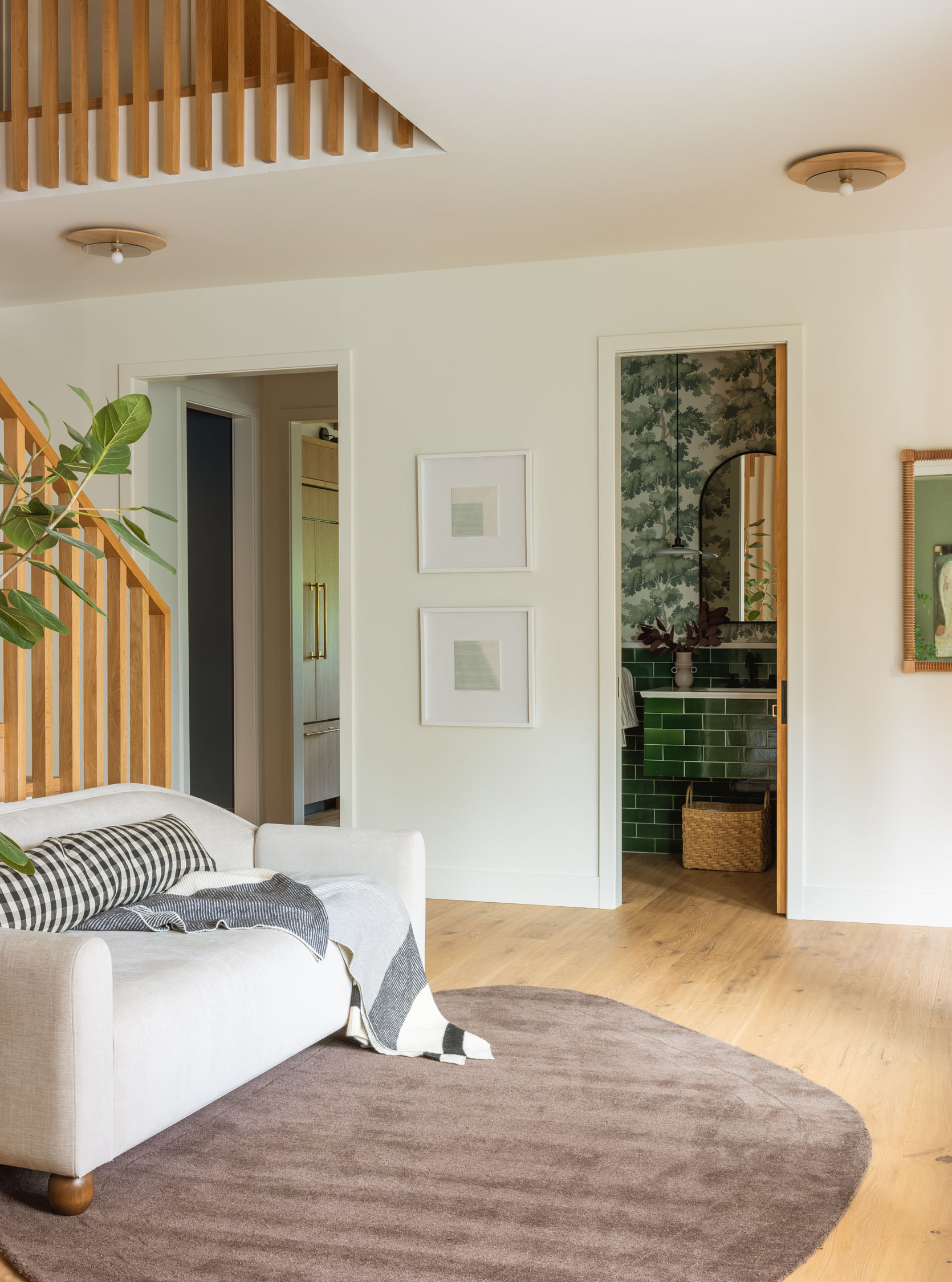 The foyer off the entry of the river house is one of my favorite vignettes. The contrast of the clean, round sofa against the busier striped warm wood just felt perfect.