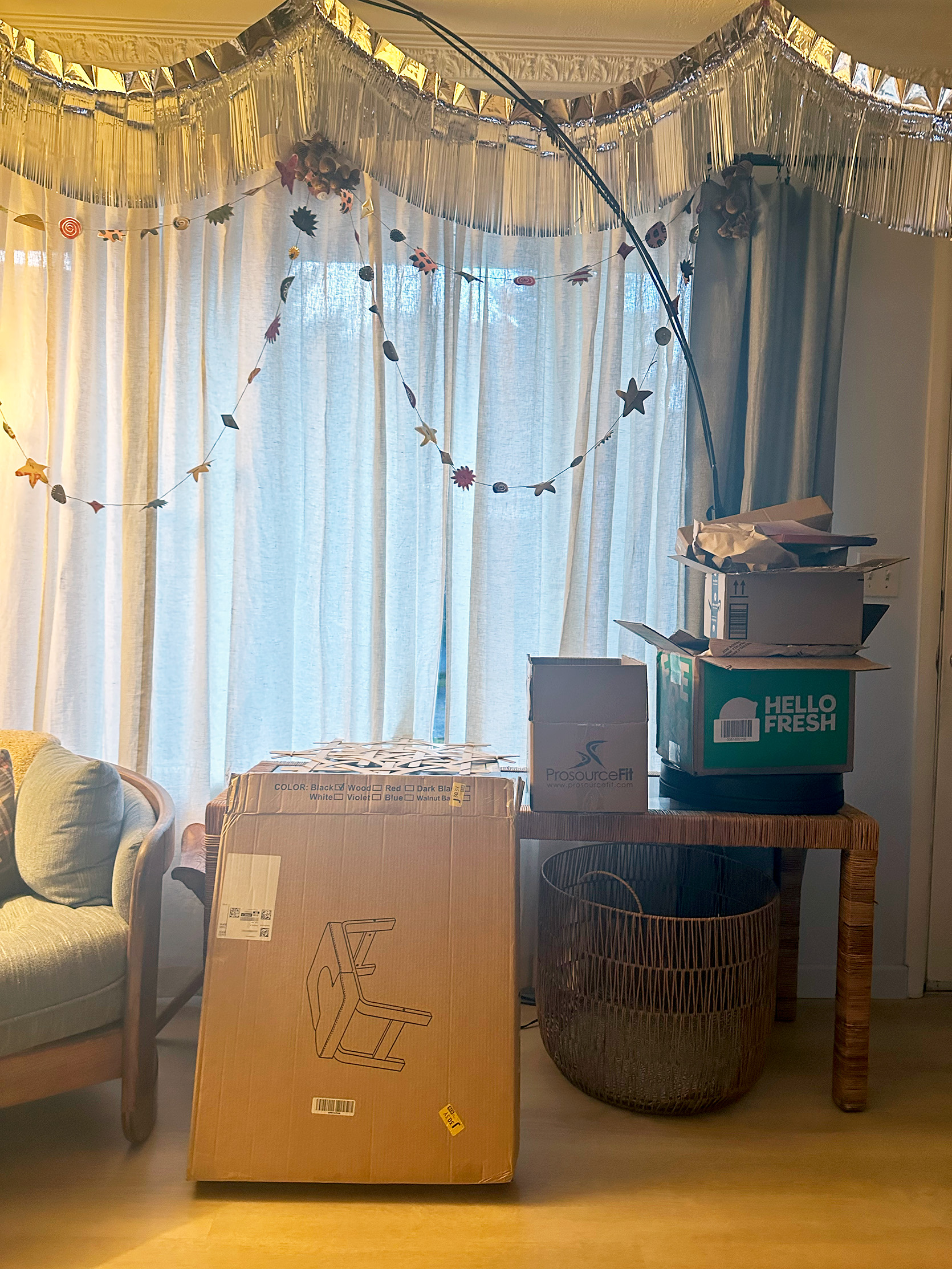 Cardboard, to me, is such an underrated material. And it’s one I know we ALL have in our homes. My plan for my big pile of empty boxes is to paint or cover them in patterned paper or fabric to give them a new, slightly more aesthetic life. Painting feels like the easiest and most playful method for me, but how cute are these fabric boxes if you wanted to spend a little more time? I’ll store my holiday decorations in them, so I think I’ll paint them to reflect what’s inside, with big snowflakes or little collections of trees and stars. Are they going to be perfect? Probably not! And that’s fine with me.