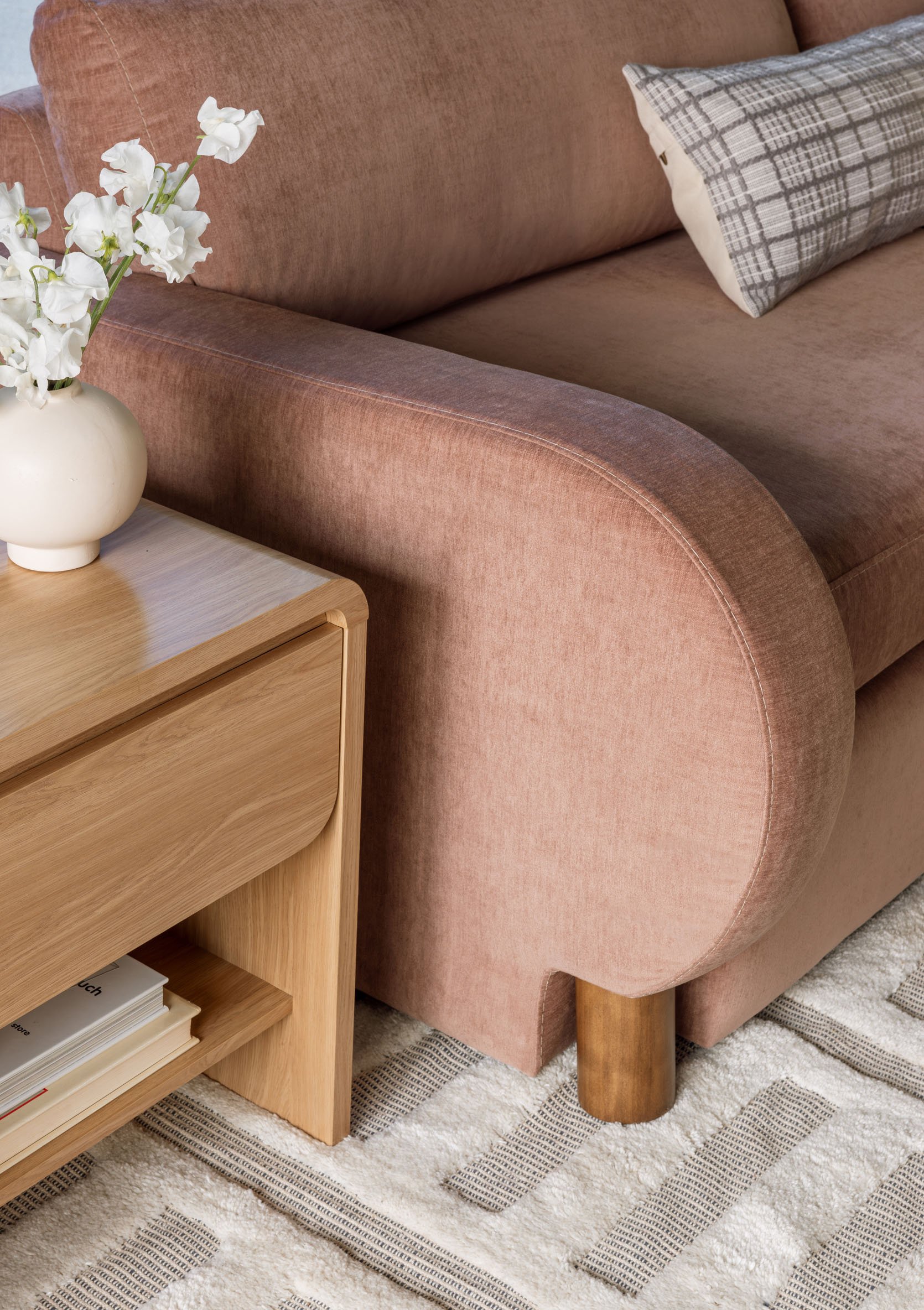Otto is where we got more postmodern with the lines – extremely clean and solid for those who want a more minimal and modern style with a strong wood chunky base. It is firmer than the others, but with a layer of cushion, so it’s still comfortable (but it’s a tight seat so less sink-in-able). We actually tweaked back pillows to be higher and more supportive (it’s a lower back) that we haven’t shot yet, which come with it, so when you see the pillows on the site, know that they are 2″ taller (which doesn’t really look different, but I’m pleased with the comfort). It’s beautiful from the back for all of us who have floating sofas, and it works really well with pieces that have more complicated lines since it’s so simple.