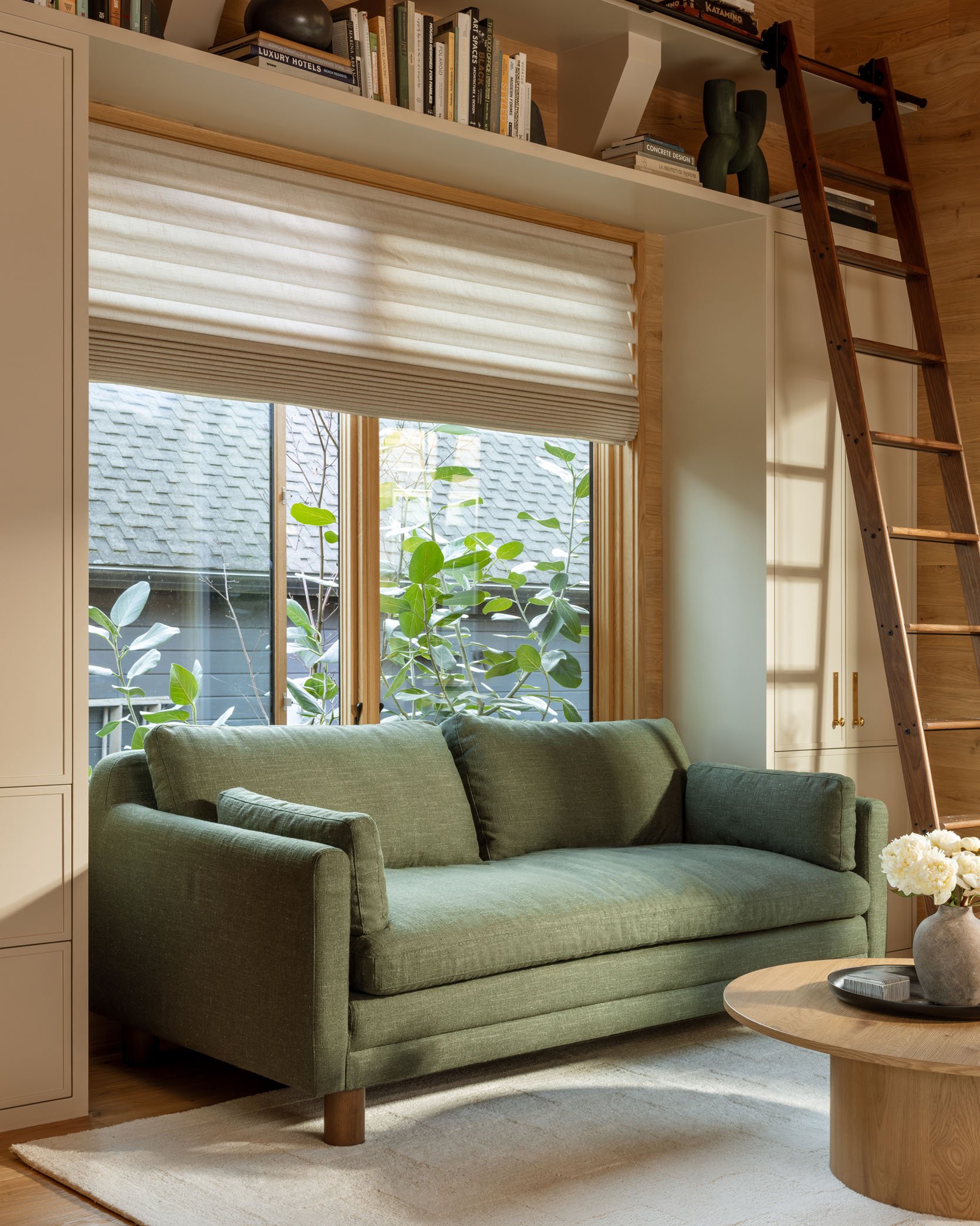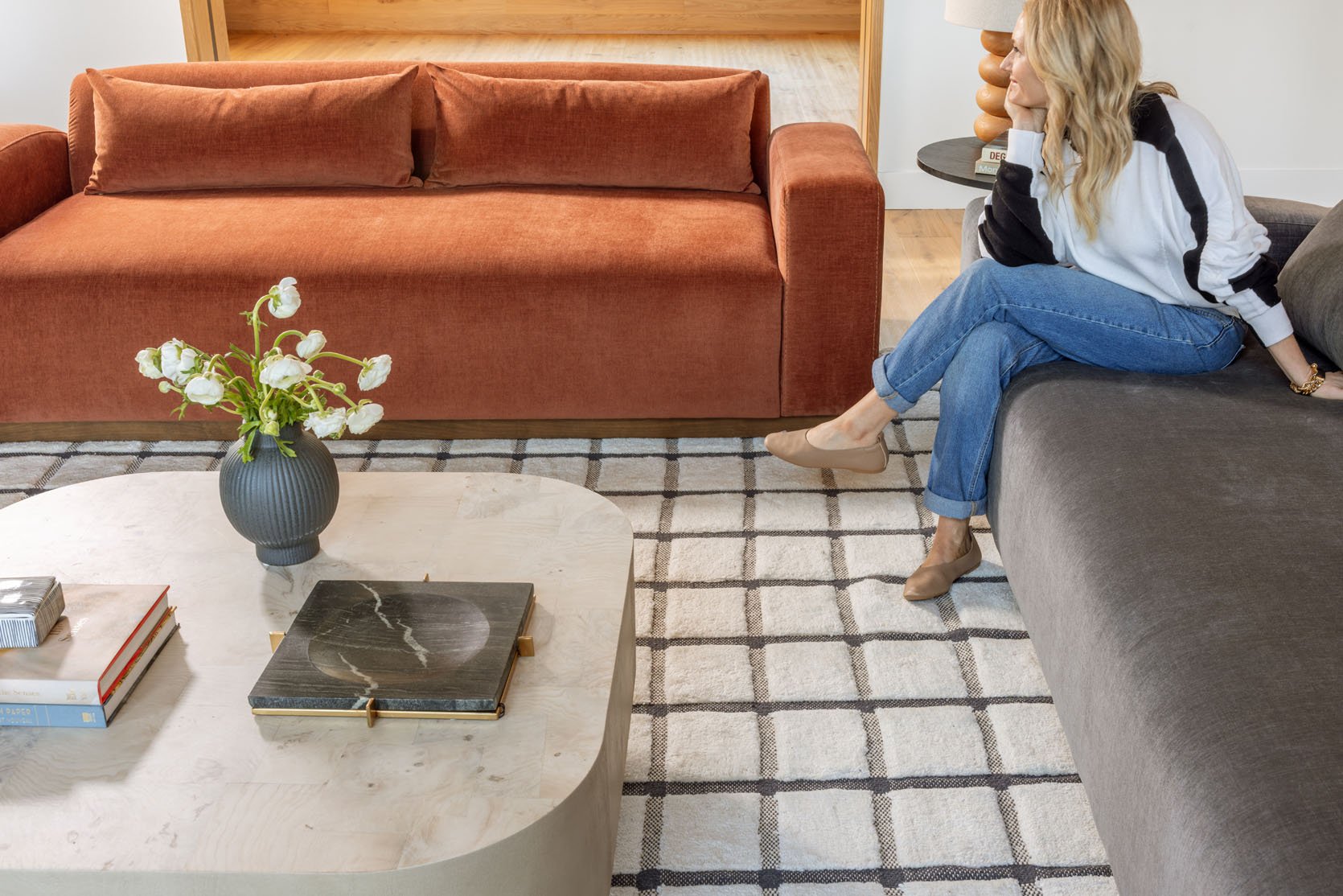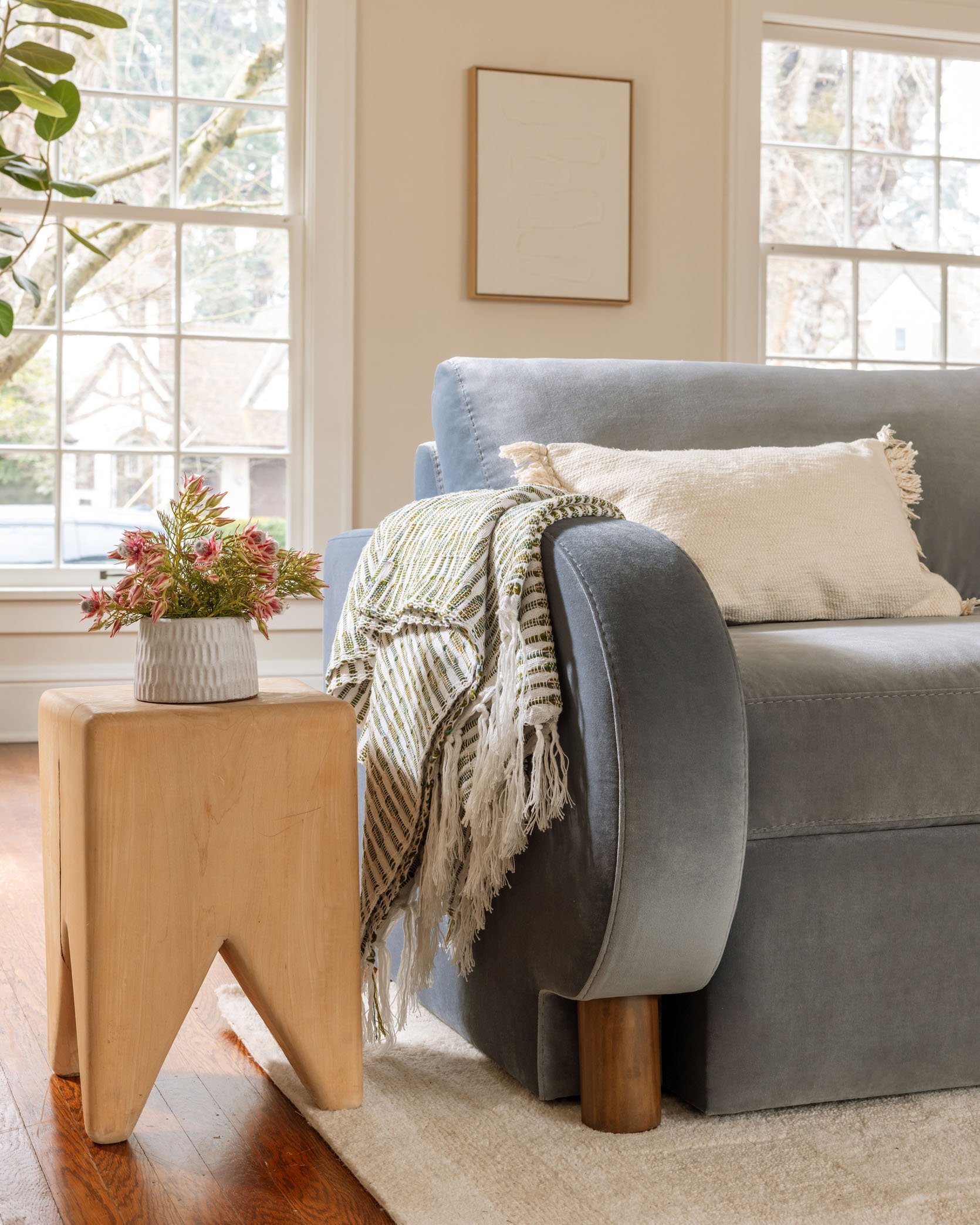 Plaid Pillow | Green Pillow | Ivory Pillow | Throw Blanket | Coffee Table | Brown Vase | Floor Lamp | Abstract Art | Rug