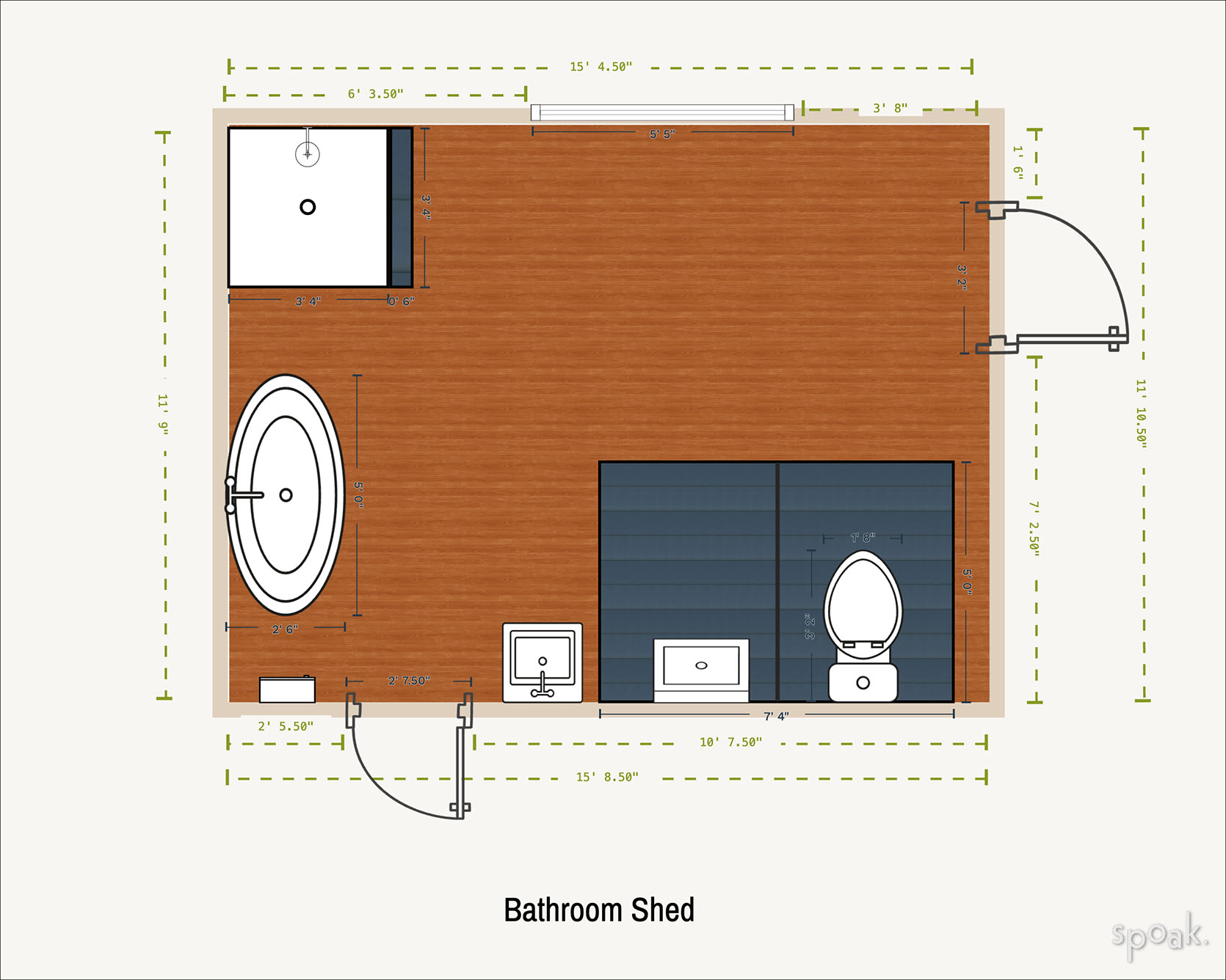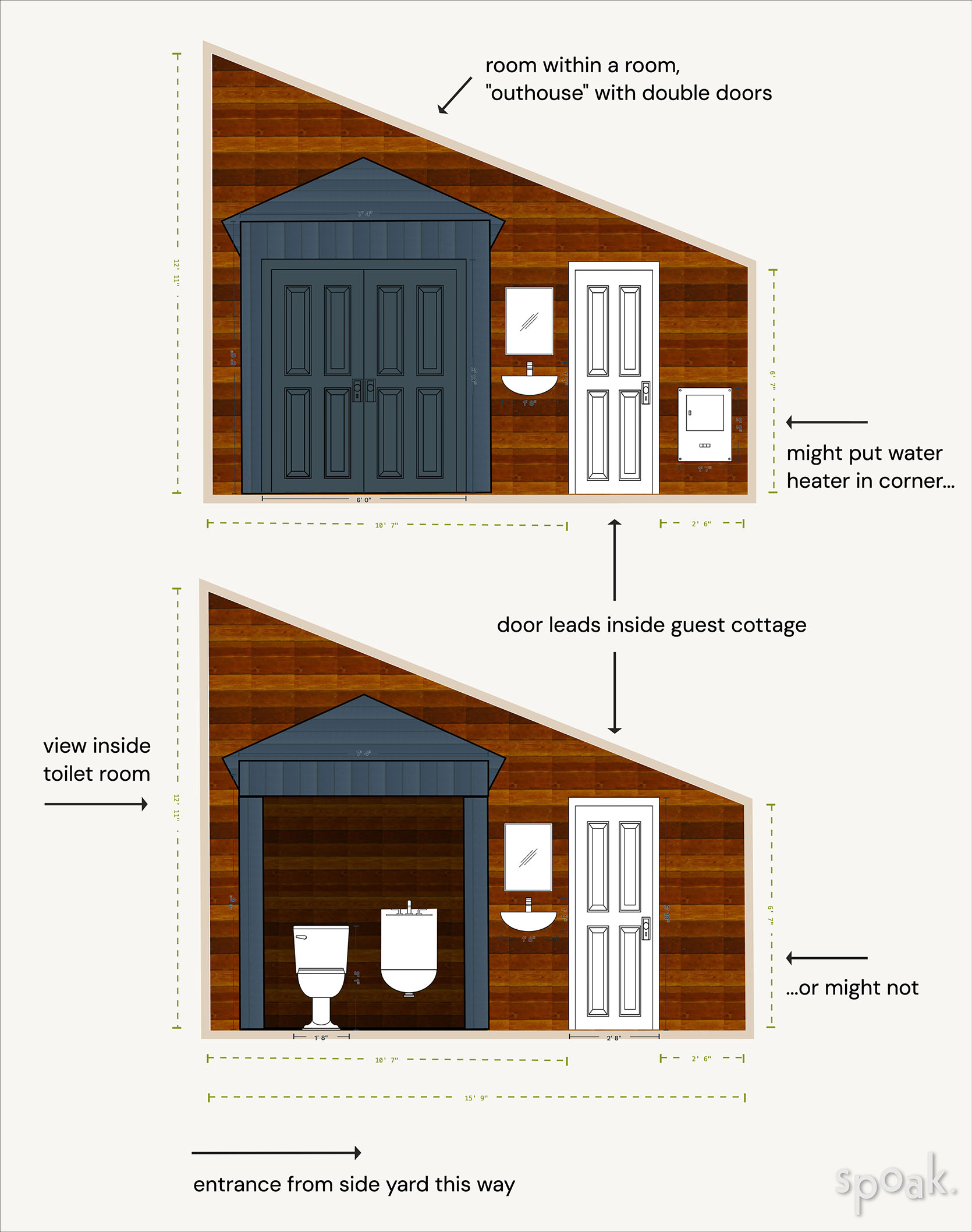 Here’s the birdseye view, which is not necessarily accurate yet but gives you a better idea of where everything is going to go. We might make the shower a rectangle, and we might do a floor-mounted faucet for the tub, etc (and pretend the sink inside the outhouse is a urinal). But I think it’s super helpful to see where we are headed.