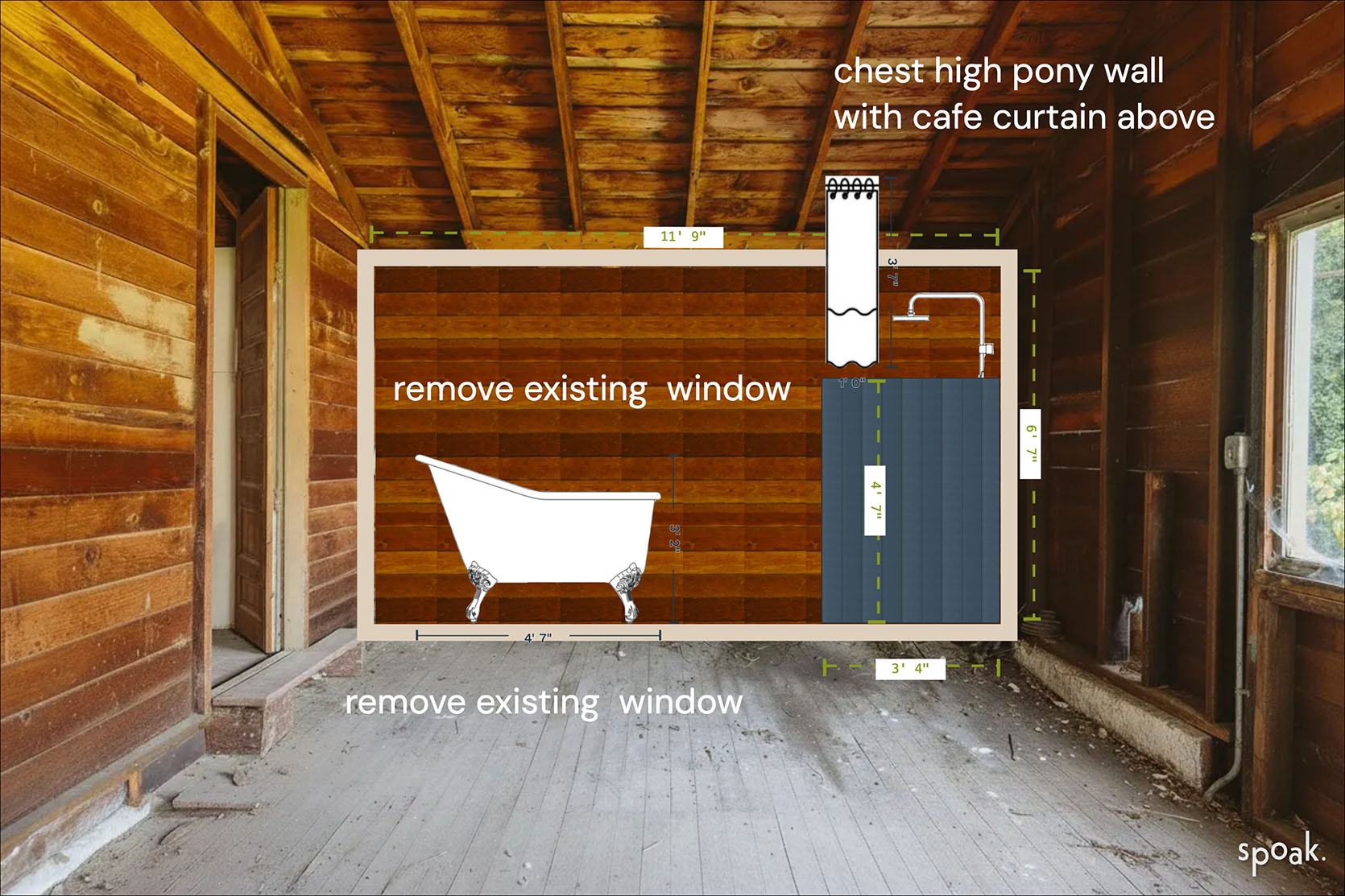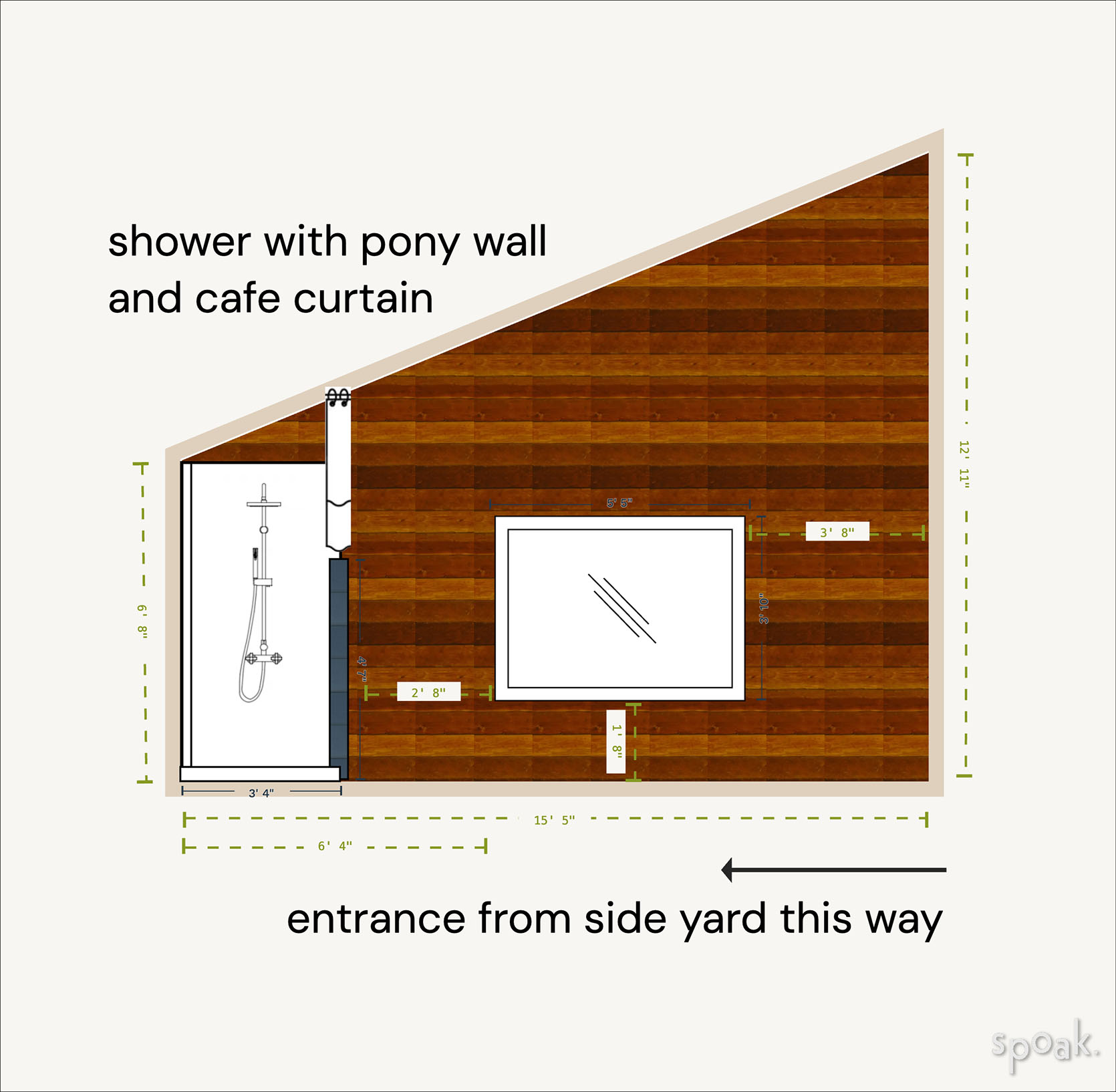 I love that you are thinking about these wild, fun ideas! As I was reading this I kept wondering if the vision is for just one person at a time to be in this room (for example to use the restroom during a party). If so, then you’d just lock the main doors while inside and not need privacy within the outhouse room, right? Or, if the idea is that a group of friends would all come into the larger room and be chatting, then having more than one toilet would be great! I do love the pony wall shower (maybe the curtain isn’t even needed!) – very summer camp and fun!