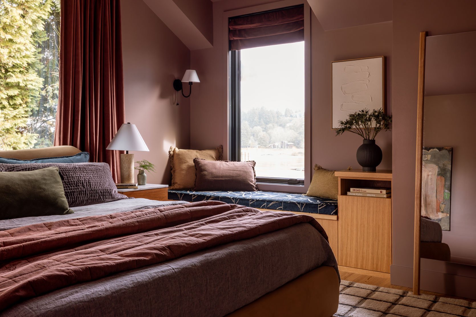 If you like big macro “how the sausage is made” posts, this one is for you. The art direction of this house was pretty clear from the get-go, four years ago. The intent was to create a warm, contemporary home that was family-friendly. It’s similar to the mountain house, but with more color. When you live in sunny southern California, you can get away with a lot of white walls, the light bouncing around, delighting your eyes, but in many other places (I’m learning), you really need color to make your eyes happy year-round. And when I say “color,” for this house we leaned more tonal – nothing BIG or bold. Of course, a pink bedroom might be bold to you, but not to us 🙂 We partnered with Sherwin-Williams on this house because they have an incredible assortment of paint colors that are very high-quality, many of which I have relied on in the past over and over. I’m pretty obsessed with this color palette and would use it all over and over again.
