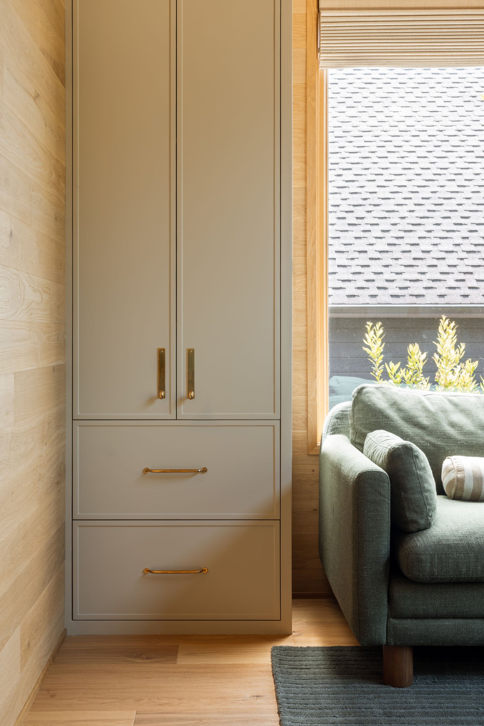A sneak peek into likely my favorite room, the game room. This room is clad in wood, so we wanted the cabinets and shelves to pop a bit, but not be the star. So we chose a neutral tone, which we properly obsessed over. We wanted to pull the lighter tones of the wood out without going to pink, yellow, or brown. It was hard!! Thank goodness it was exactly what we wanted because the labor for painting custom cabinetry is so expensive (regular drywall can be easily DIY’d, but cabinetry is specific). Malabar SW 9110 is a light taupe, they call it a “sandy beige” with slightly yellow undertones and a 54 LRV.