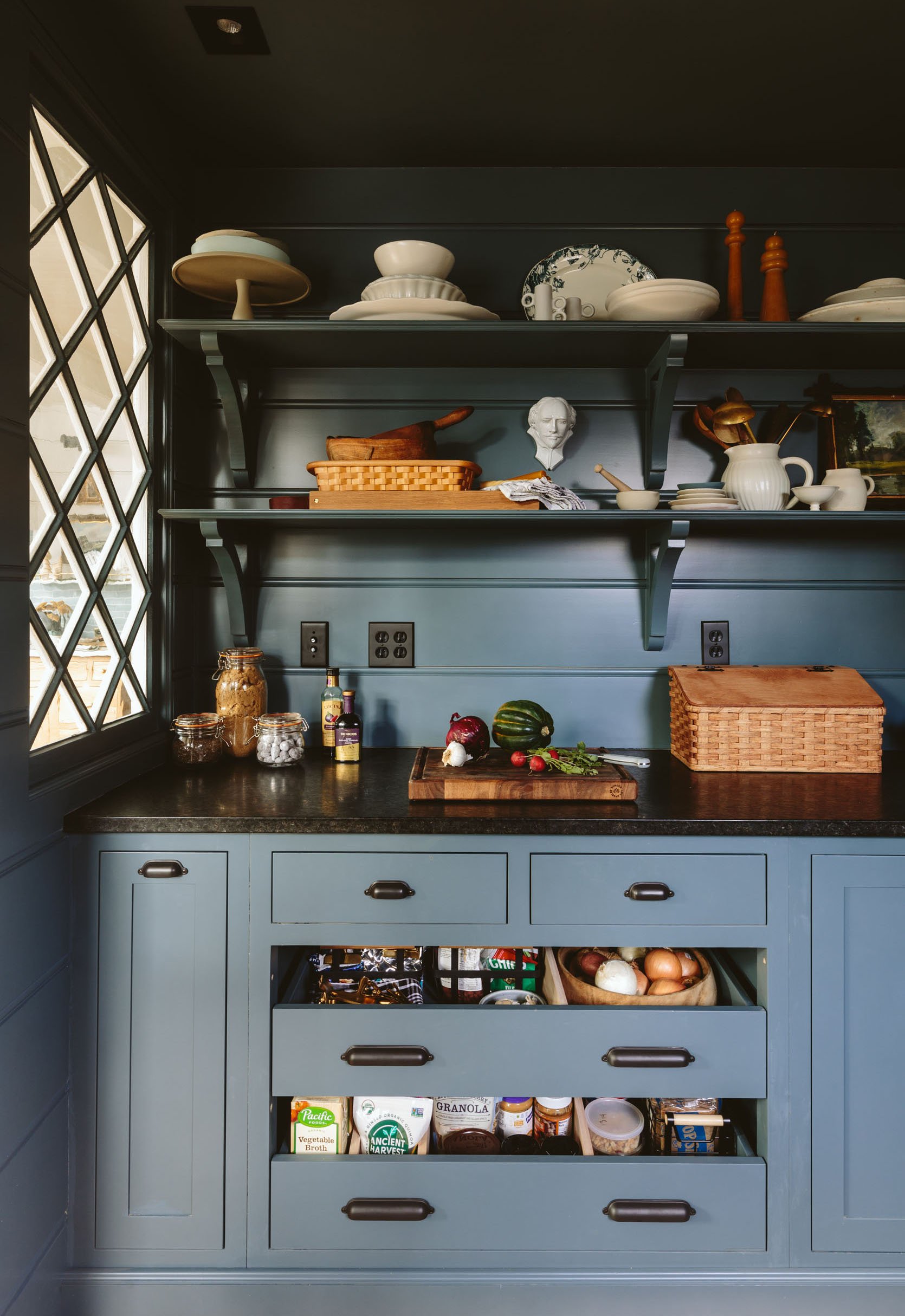 I actually decant as an inventory system! I cannot overstate how much it helps my brain. A full box of cereal looks exactly like an empty one, but a glass jar holds no secrets. I decant a few things in the pantry, to help me actually use ingredients (out of sight out of mind… just me?). But the real star is two open shelves in the main kitchen which hold our daily use stuff (mostly breakfast), so everyone in the family knows when we run low. This way, the grocery list doesn’t live in my brain alone. We are never caught off guard at 7am with no Cheerios. HUGE function improvement in our house. If this is a pain point for anyone else, I highly recommend a few glass jars in a visible spot. Looks cute, but works hard!