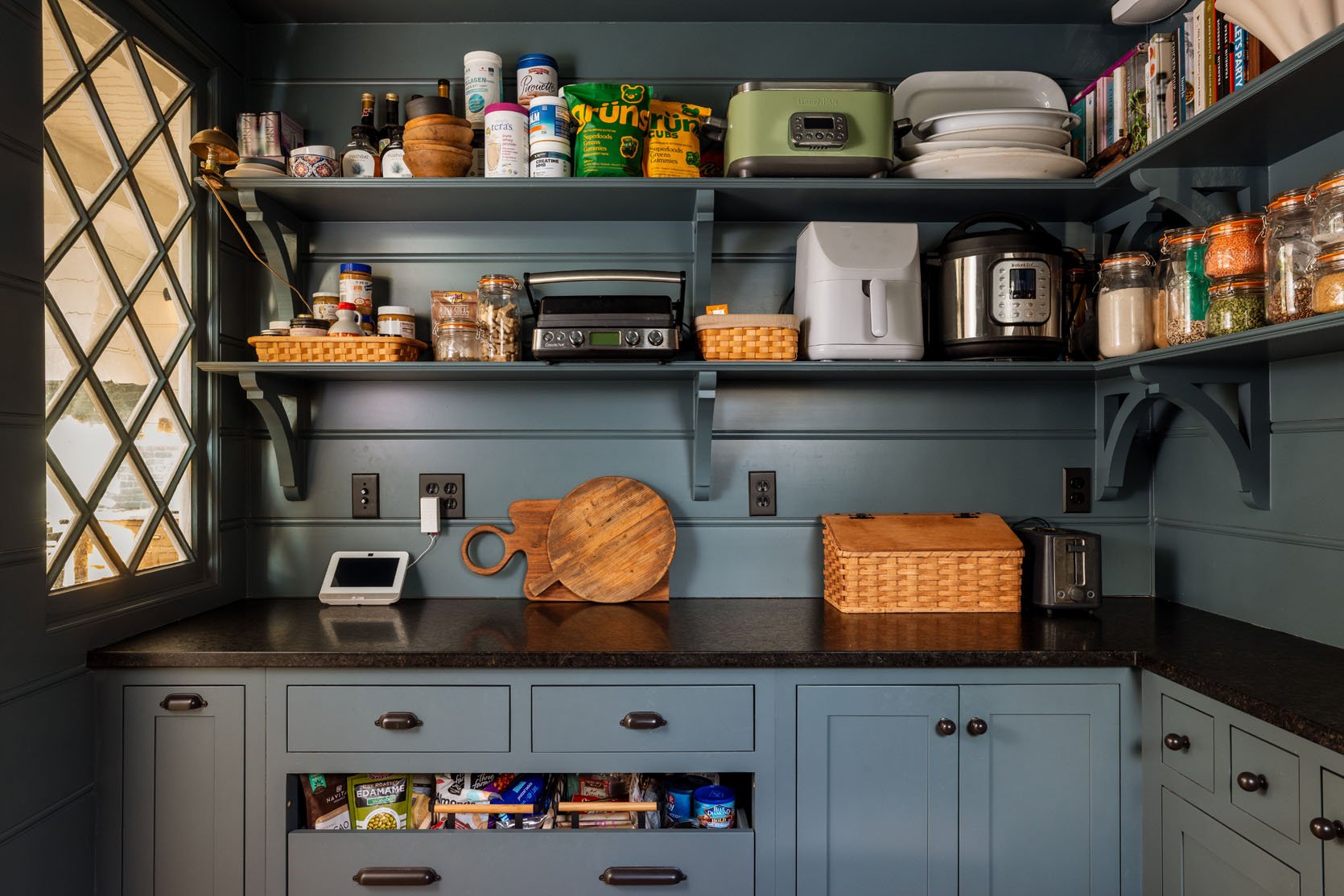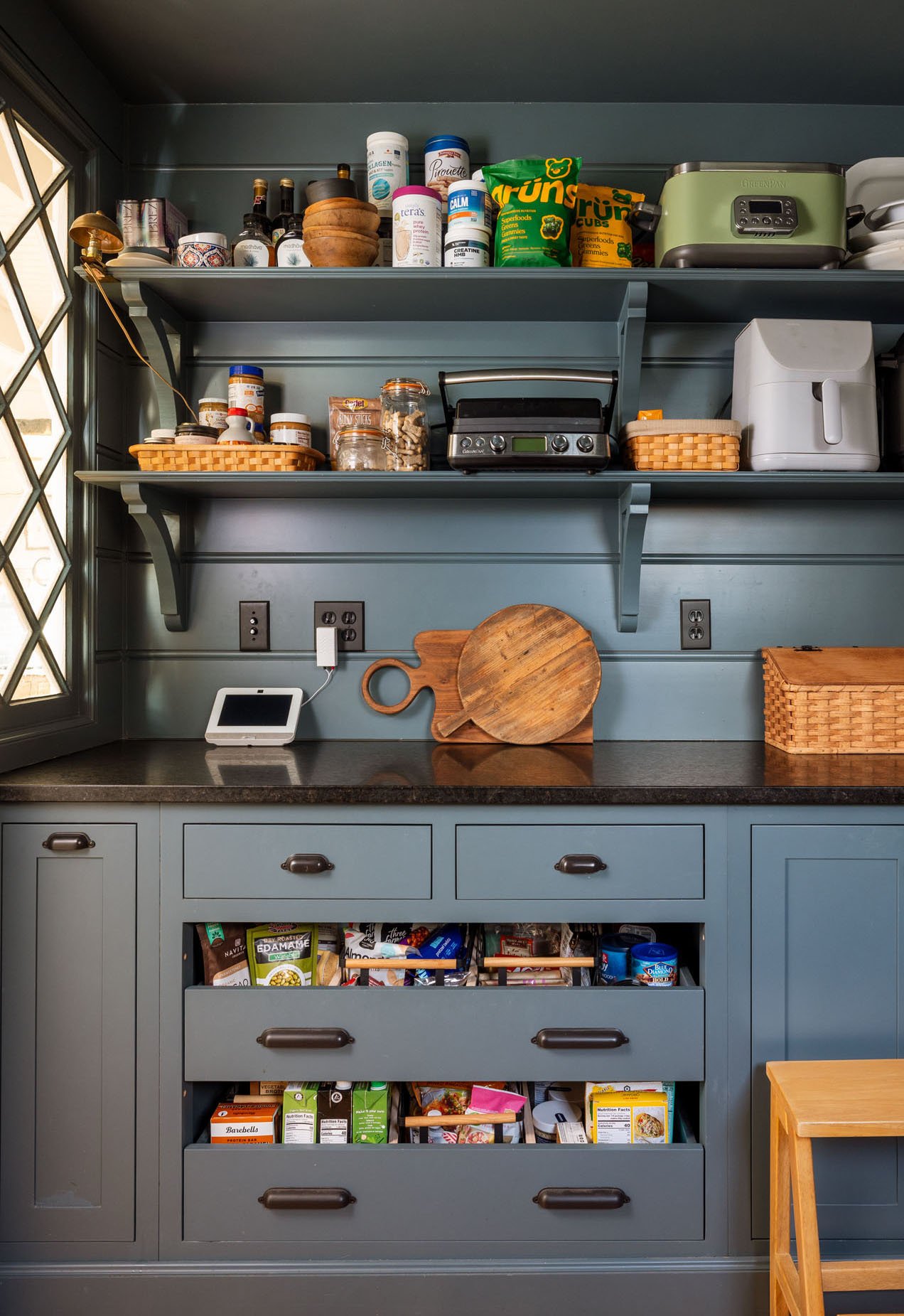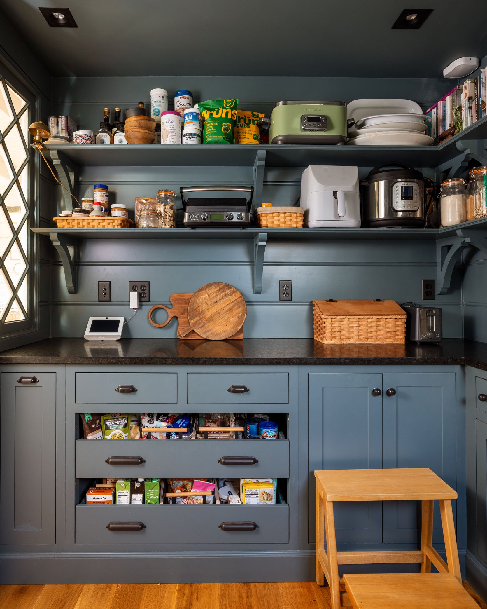 LOWER SHELF: Peanut butters/honey/syrup, dog treats, panini press (kids love these sandwiches), basket for some treats out of reach of kids. Then the air fryer (weeknight chicken strips), which we can plug in below and not even move it down, and the Instant Pot (weekly hard-boiled eggs).
