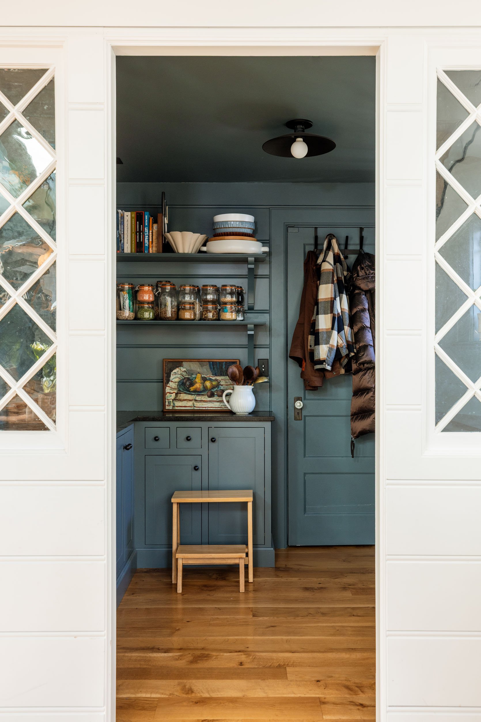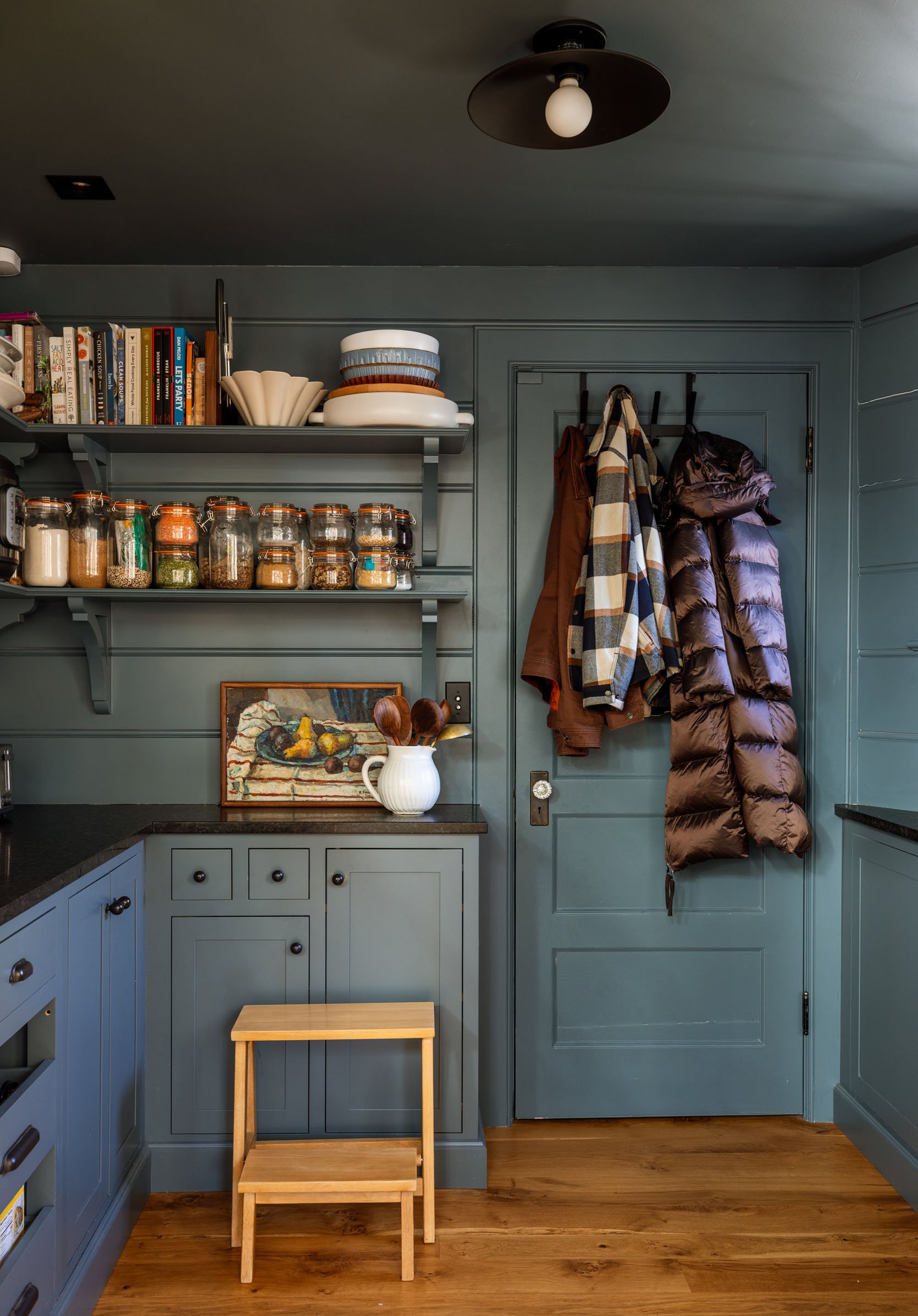 This wall has remained very similar to how we styled it originally, mostly because it’s a sightline that you see from entering the house and while in the kitchen, so it has to look really pretty, or it would bum me out on a daily basis. I love our decanted jars (and for the most part keep up with them). Naturally, the pretty apron and broom were crowded out by the one billion coats that you need in Oregon. Here’s what it looks like now: