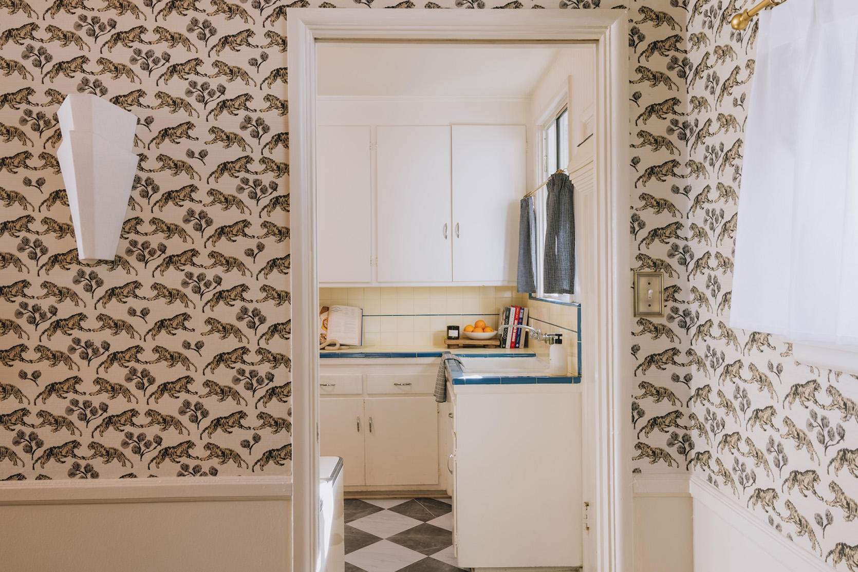 Wallpaper | Sconce | Paint Color | Floor Tiles | Cookbook Stand | Bowl | Candle | Tea Towel