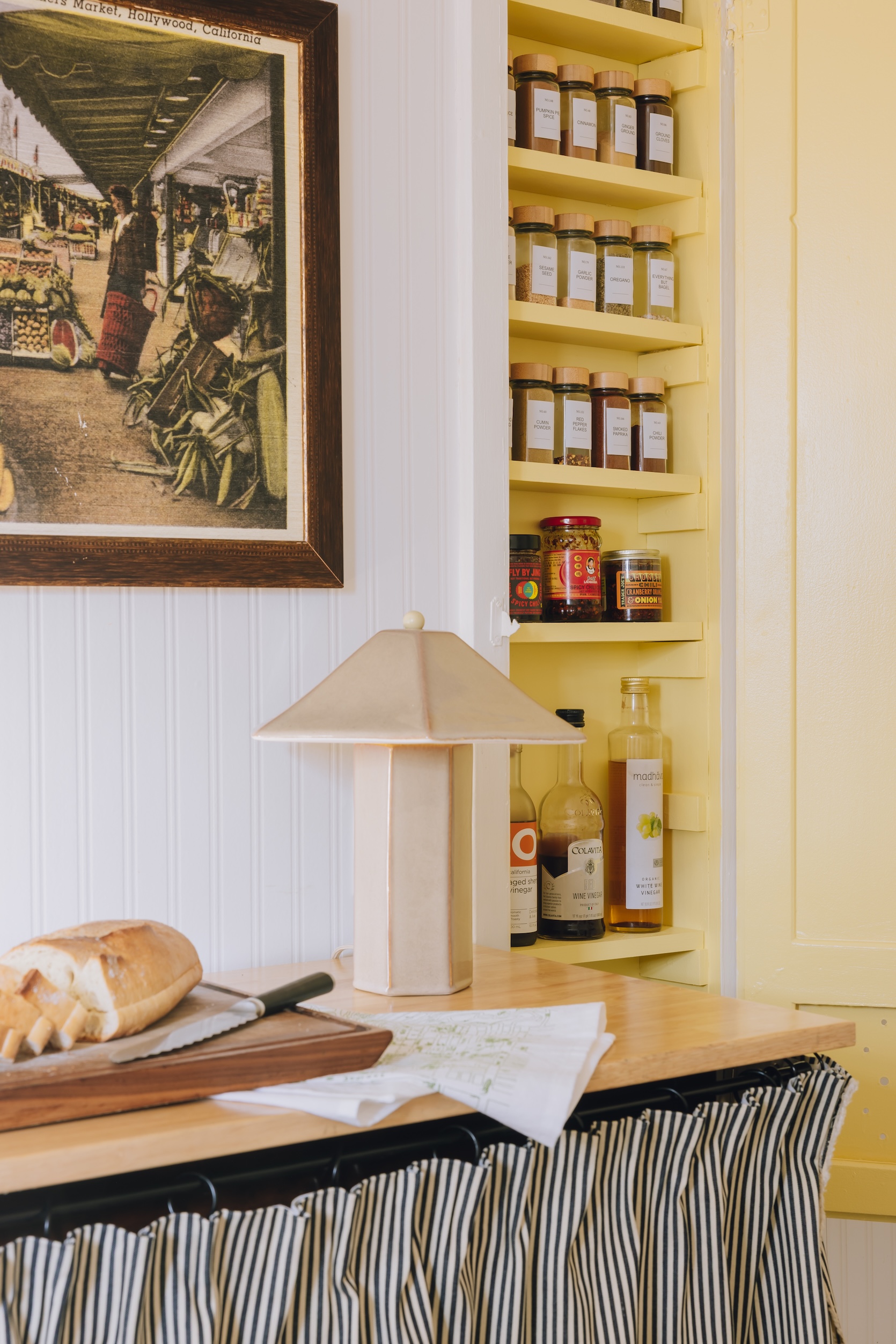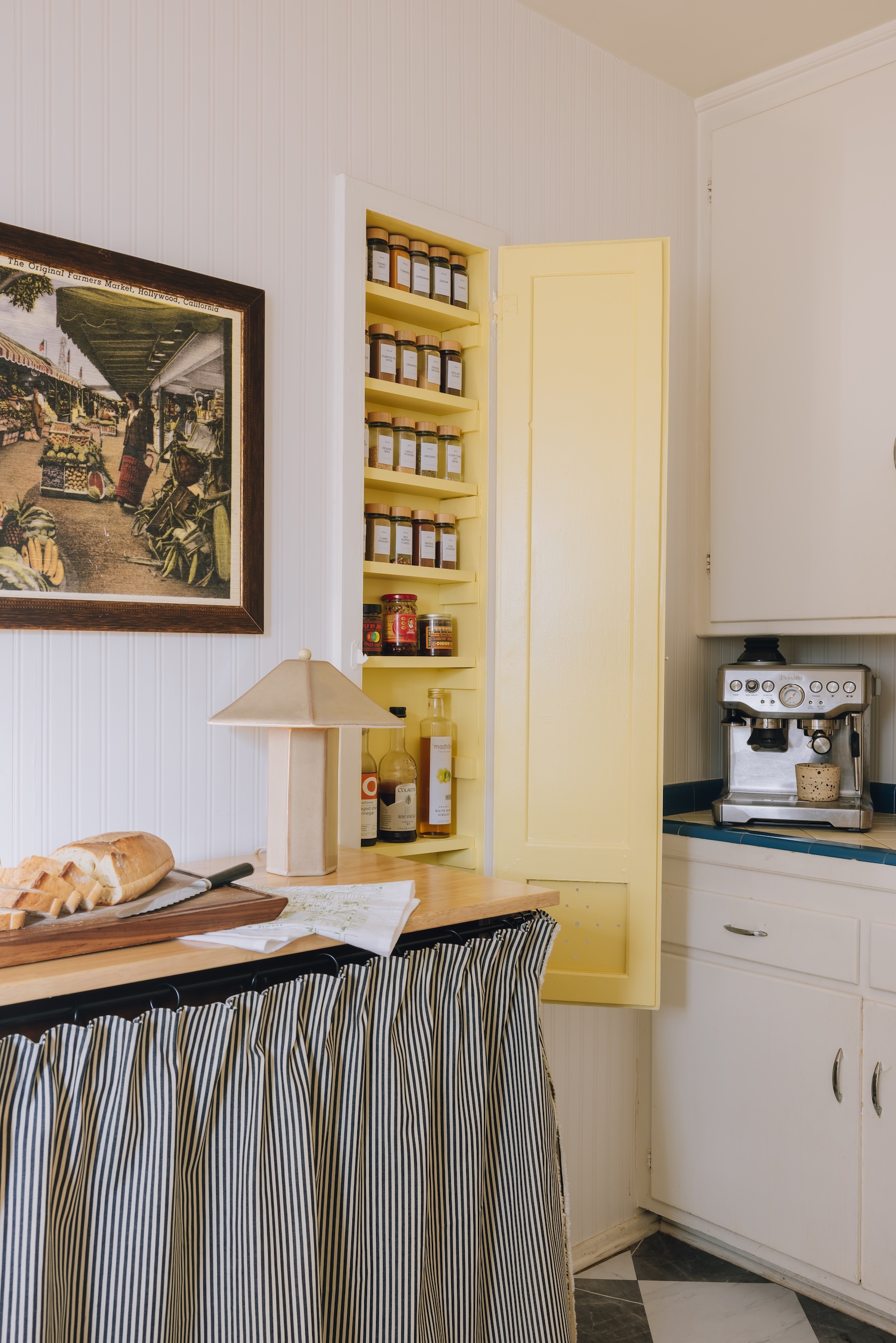 Spice Cabinet Paint Color | Spice Jars | Lamp | Cutting Board | Prep Table | Skirt Fabric | Breville | Breville Single Dose Hopper