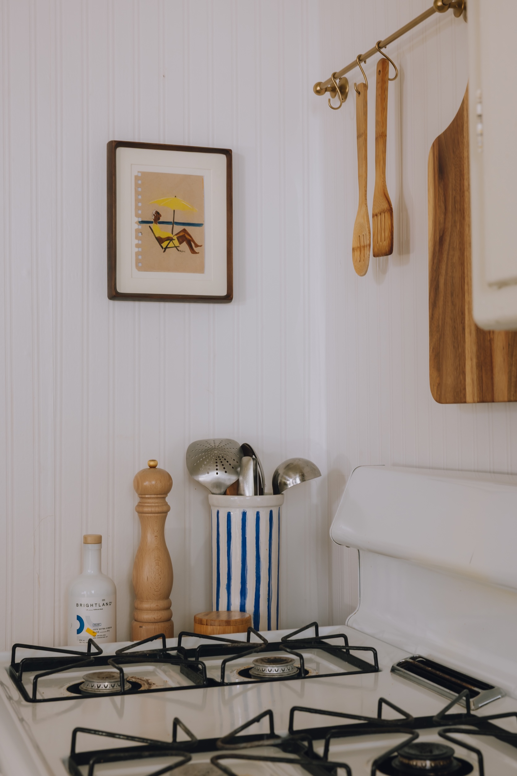 Here’s a better look at the beadboard wallpaper – it added SO much charm to the space, it was crazy!! And since it was pre-pasted, I just had to spray some water on the back, so it was super easy to install. Now let’s all focus our attention on my favorite art piece, shall we?? You might know this already, but one of my favorite places to find art is the Sawdust Festival in Laguna Beach – it can be hit or miss, but last time I went, I found this amazing animator and artist who used to work for Cartoon Network named Mucci. He was selling some of his sketches and artwork from his sketchbook, and I came across this one and absolutely fell in love. It was $100 for the piece, but since it was an original and it spoke to me SO much, I knew it was worth it, and I will cherish it forever.