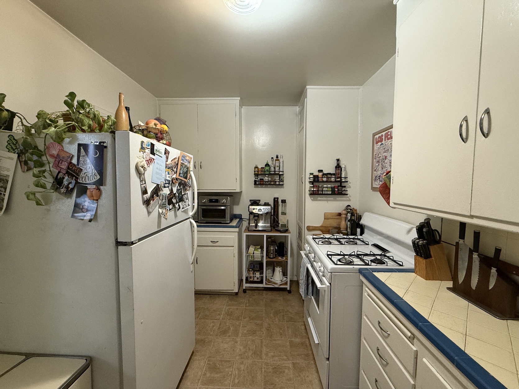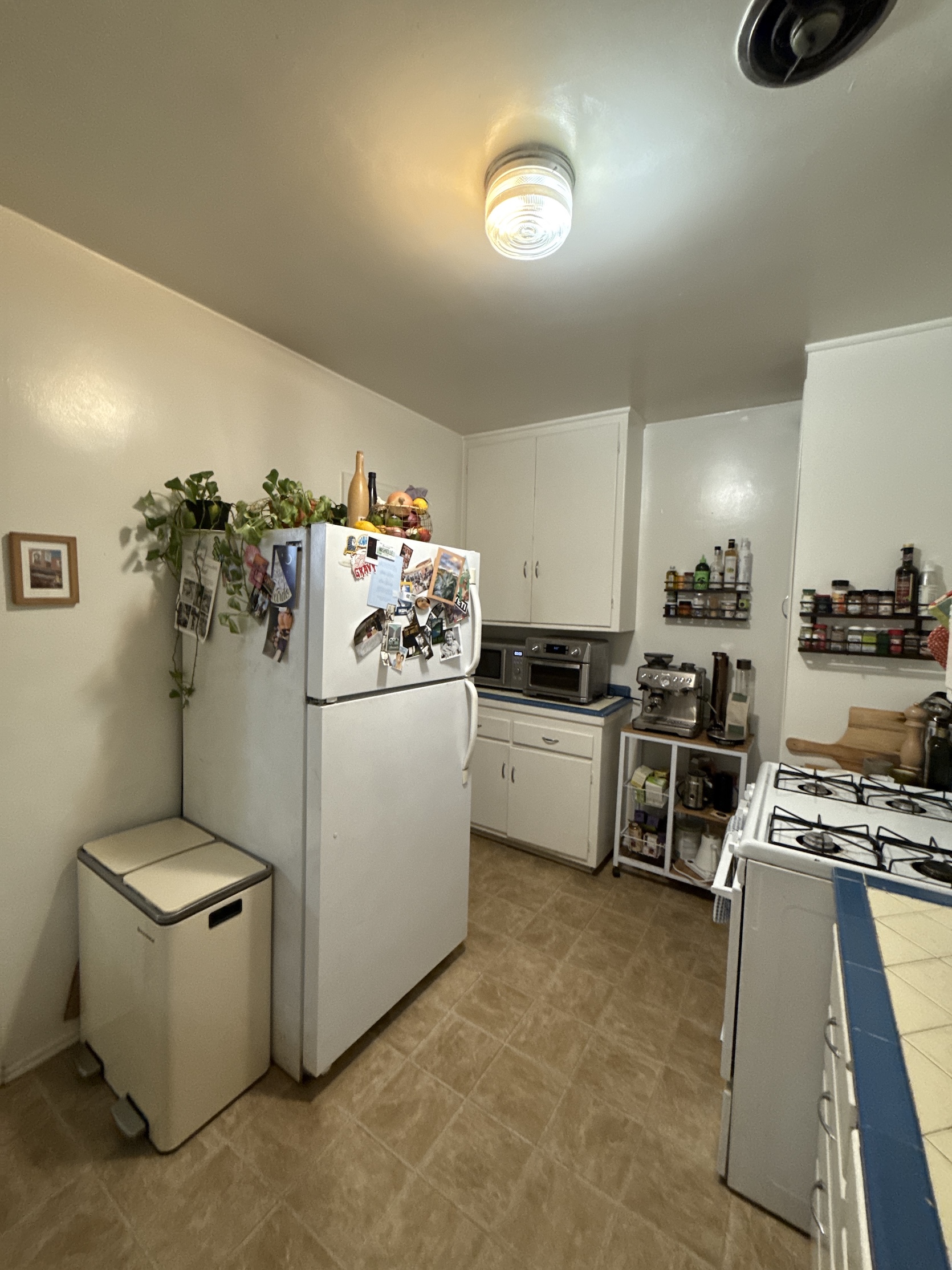 Welcome to (what used to be) the tiniest, ugliest room in my apartment! When I moved in, I knew the kitchen was less than ideal, but with the apartment price, location, and roommate (hi Jade!) all perfectly aligned, I knew I could make it work. When I first toured my apartment, I knew it had amazing potential, but it was in need of a ton of love. The building is from the 1950s and had a ton of adorable original details still intact, but it was certainly given the “landlord special” a few times over. Every apartment has its pros and cons, and for this place, the pros were that the living, dining, and bedrooms were all decently large, but the major con was that the kitchen was teeny tiny. Well, tiny for LA standards at least…my New York apartment kitchen would be so jealous it would probably block this kitchen on Instagram. BUT considering my roommate and I both love to cook and are often both in the kitchen at the same time, this room is very, very small. Especially because of the initial fridge placement…let me show you.