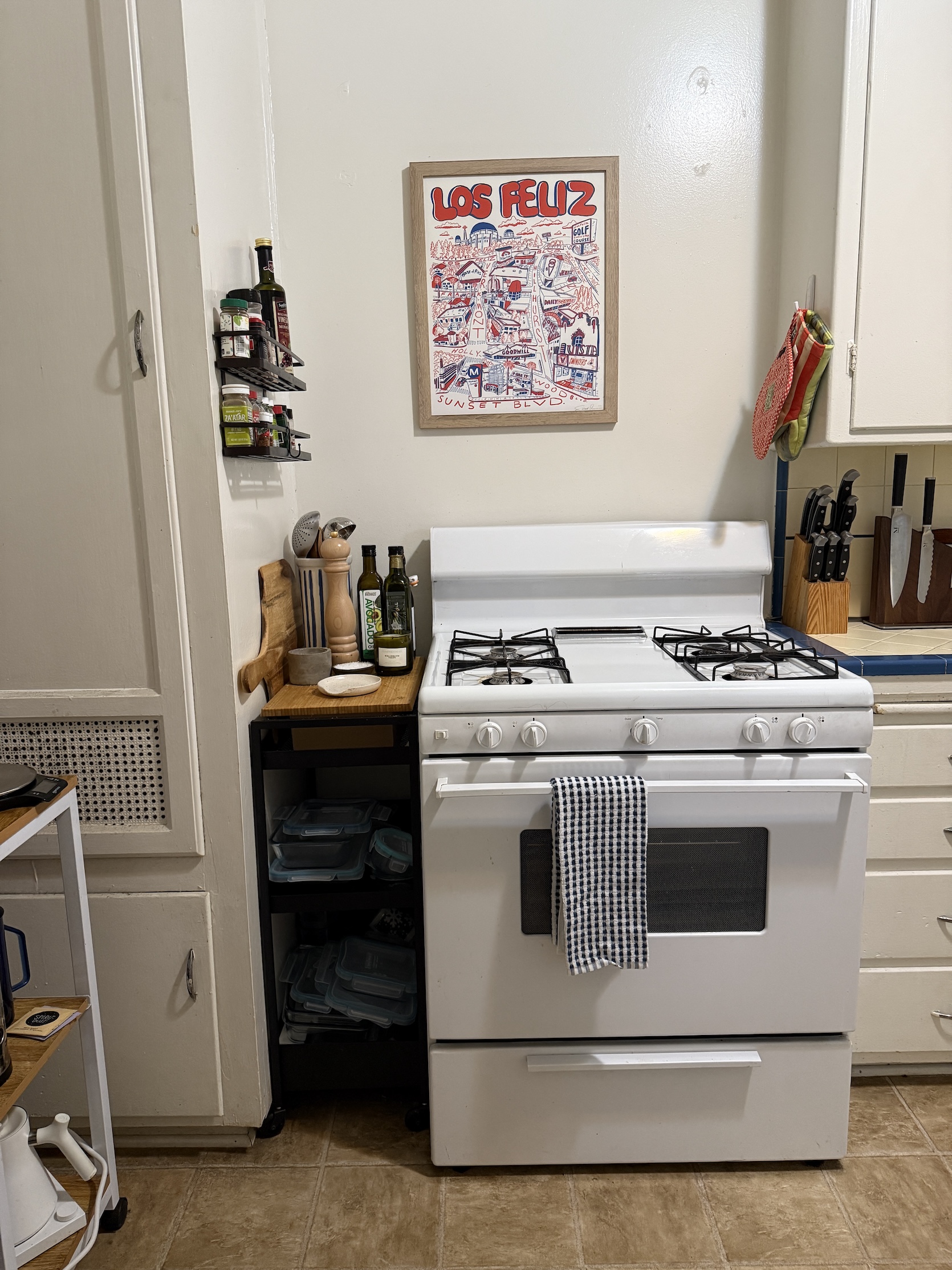 Here’s my finished kitchen!! That fridge nightmare ended up being SO worth it, and I can’t wait to take it with me to my next place and beyond. And see that little peep of a prep table?! HOUSTON WE HAVE COUNTER SPACE! I didn’t end up changing the hardware or painting the cabinetry like I initially thought I would (at some point in a rental, you gotta know when it’s no longer worth it to spend the time and money) – every DIY I did in here was so high impact and so worth it and I actually love how light and bright the space is. It went from hell to cook in to a heavenly place to cook in!