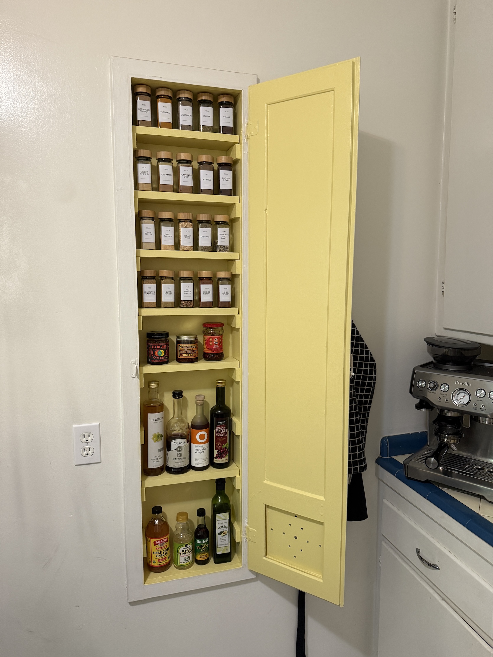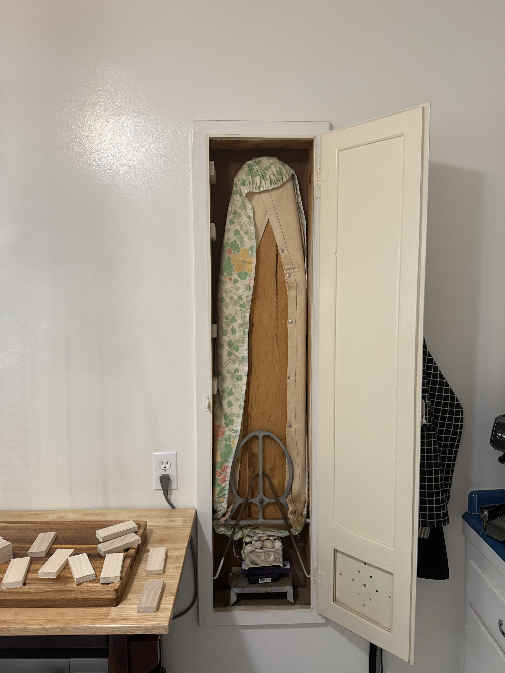 Next up, I had this vintage ironing board, which is objectively awesome, but we never used it, and the fabric was pretty nasty and old, to be frank. As a steamer enthusiast, I knew this area would be much better utilized as something else, and we were pretty desperate for more storage space, so I turned it into a fun yellow spice cabinet!!