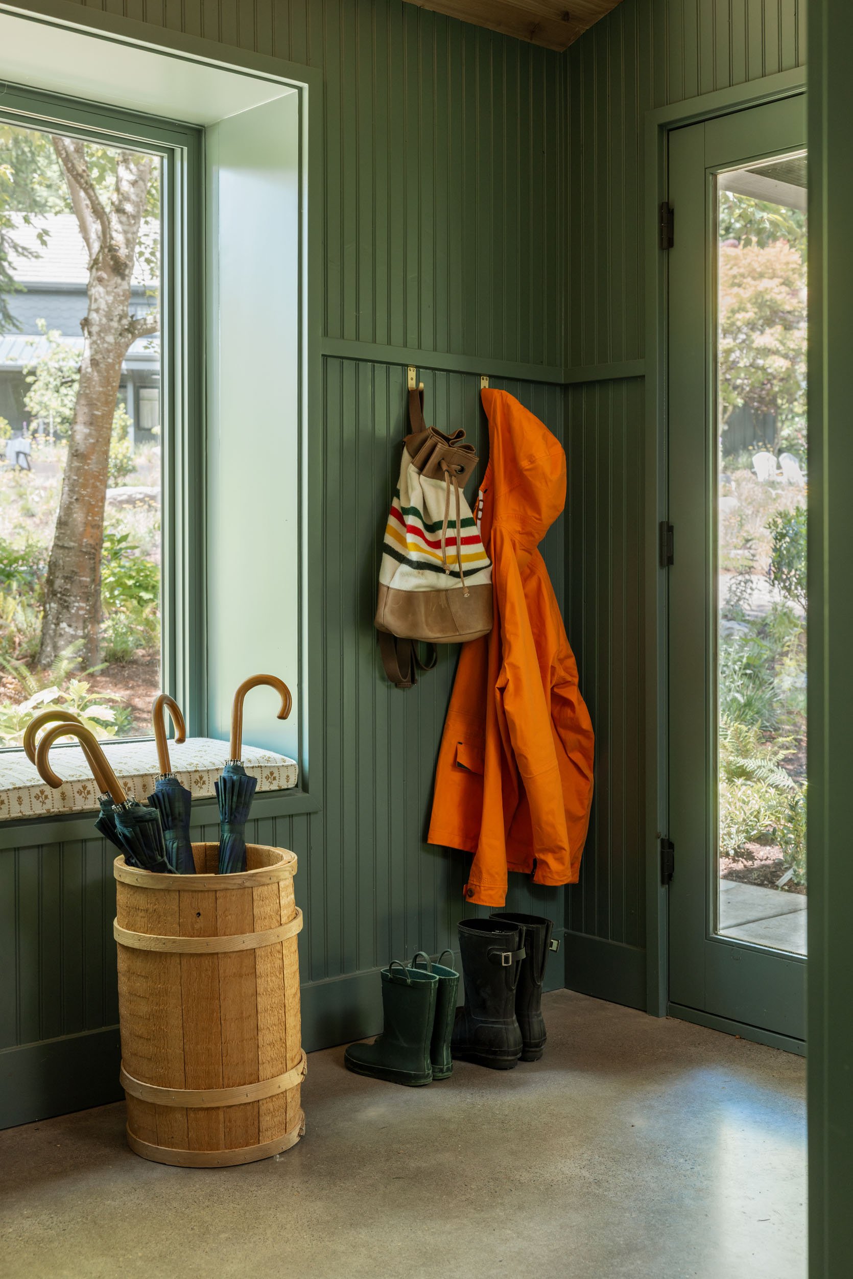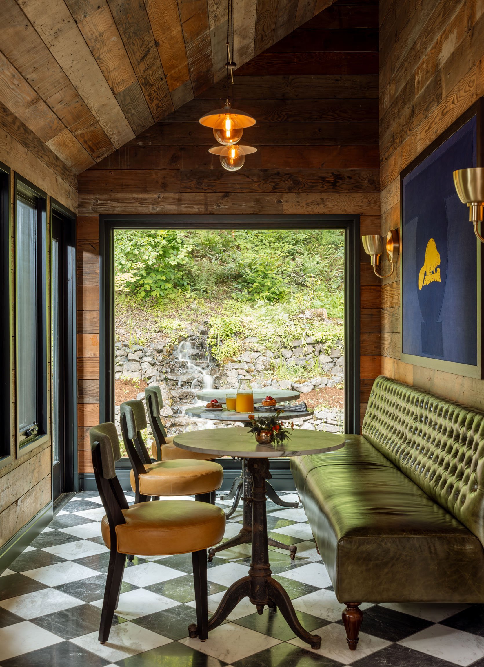 This was one of my favorite places to sit in the morning with my laptop and coffee. Please note the seasonal stream right out of the huge picture window. The custom green leather banquette adds so much dimension – I love how they chose such tight tufts to catch the light like that, creating a pattern out of a texture.