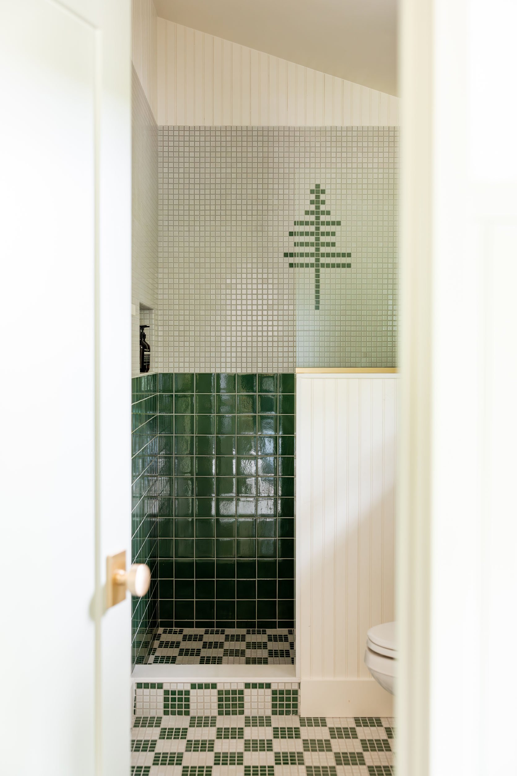 This bathroom felt so “Max Humphrey” to us – the whimsical tree tile element is extreme Pacific Northwest charm. I love the checkered mosaic floor in that bright grass green.