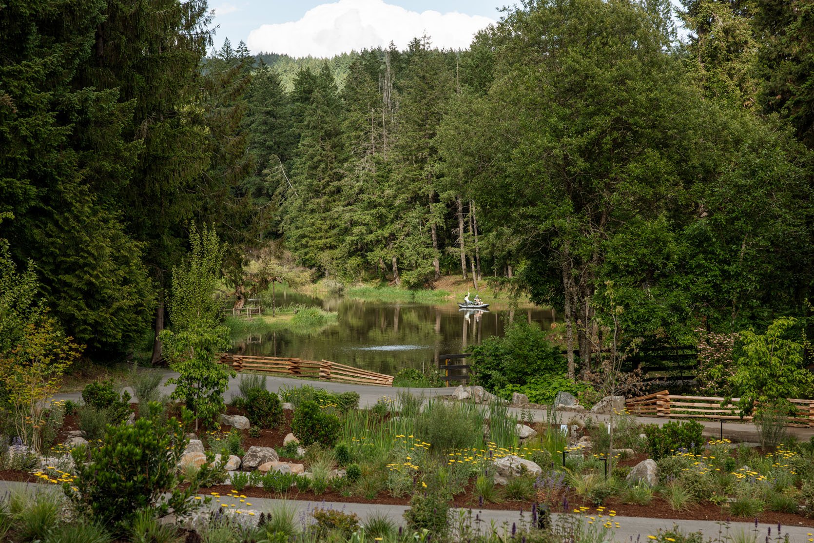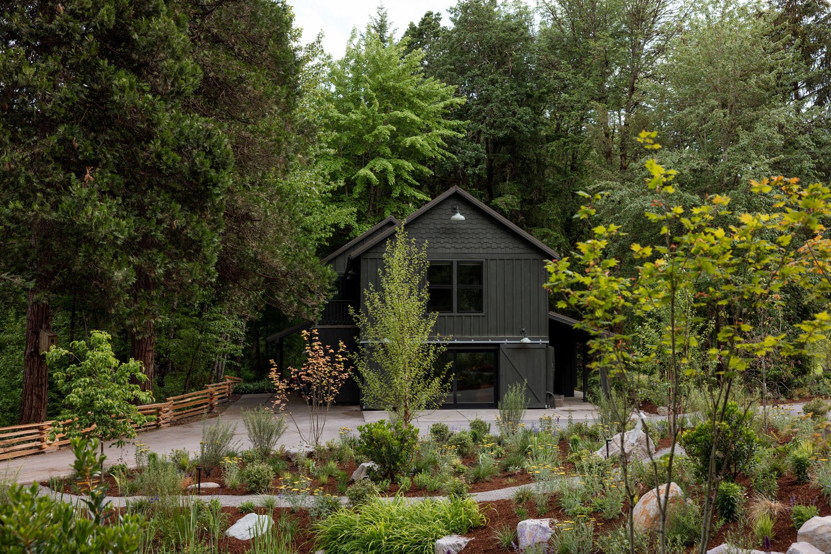 There are two main buildings for sleeping – the Fern Lodge and the Hummingbird Cottage. Pistils Landscape Design did the landscaping, and it’s pretty amazing. The Fern Lodge has five suites (sleeping 10), all with king beds with en suite bathrooms. It has a commercial-style kitchen that is still so cozy for pizza nights and a media room for movies/presentations.