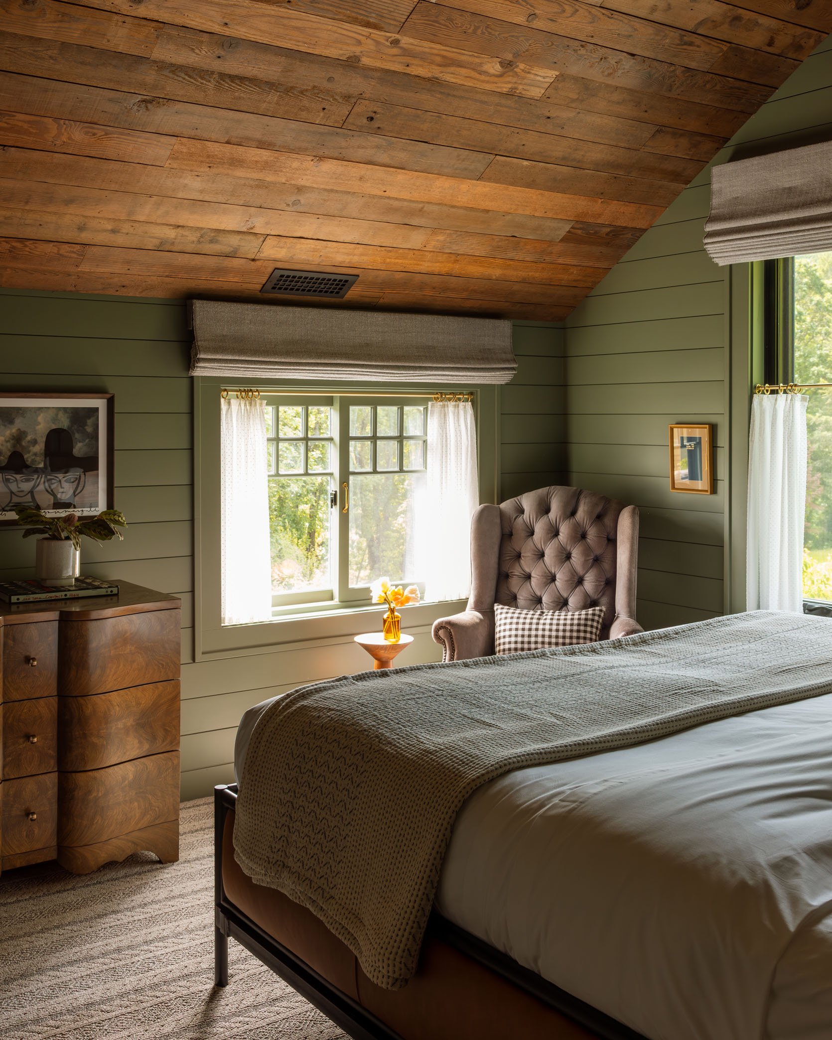 Another room with a huge king bed and a cozy paint color. Fun fact, they picked up that tufted wingback 12 years ago right after I won Designstar 🙂 The wall-to-wall carpet in here is so chic and cozy.