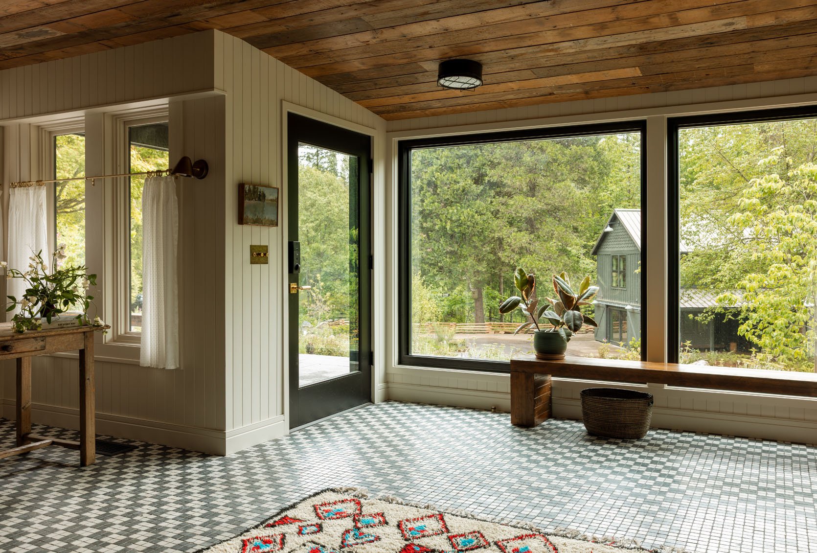 Through the entry, you can see the other house on the property, the “Hummingbird Cottage” that they actually did first, more of a cosmetic remodel while they were waiting for permits on this larger lodge. You can rent out both buildings, which gives you 4 additional suites (so 9 total) and more of a family vibe.