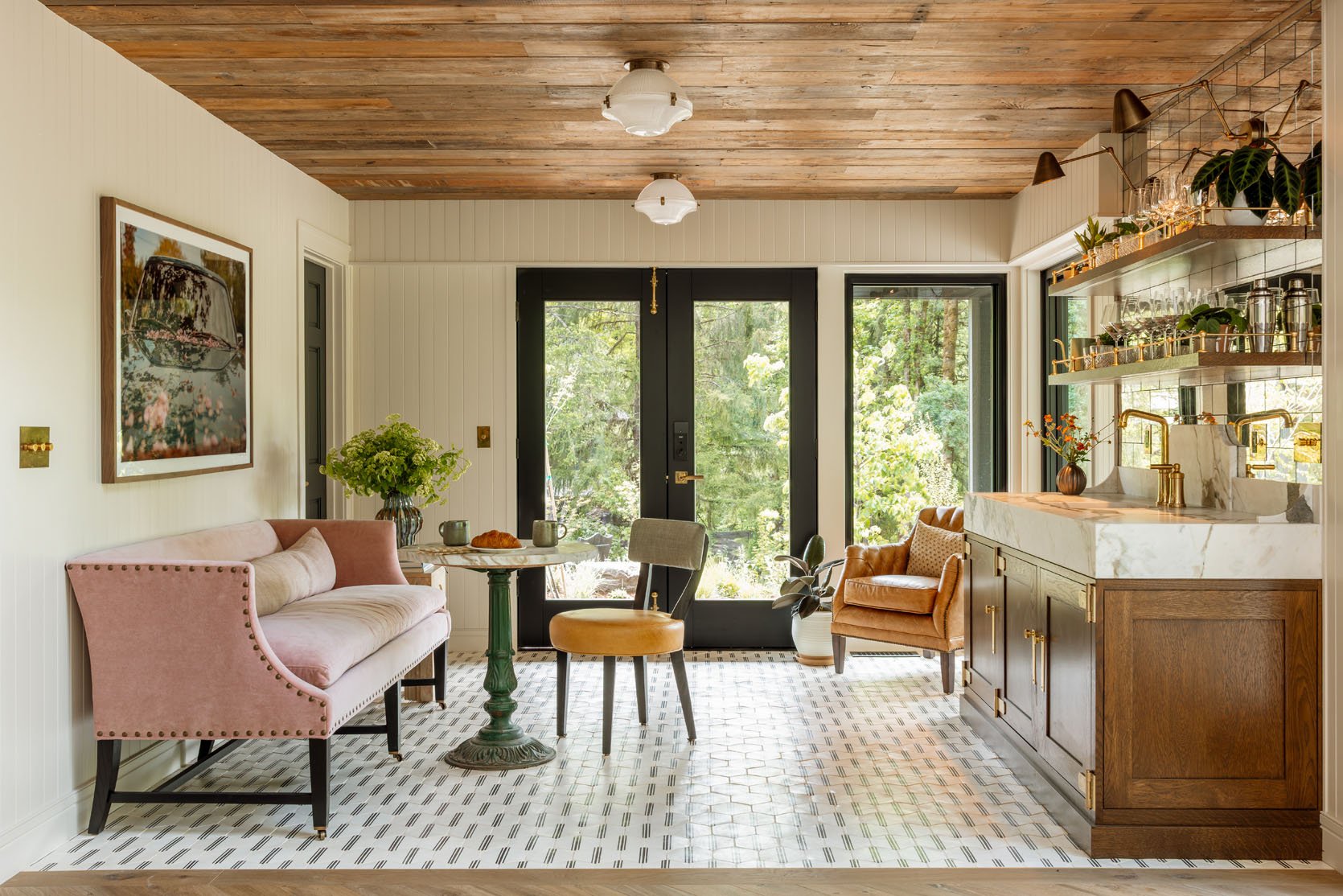 The bar area offers this fun patterned tile on the floor, contrasted with the reclaimed wood (from the old Portland race track) on the ceiling. The unexpected pink sofa delighted all of us.