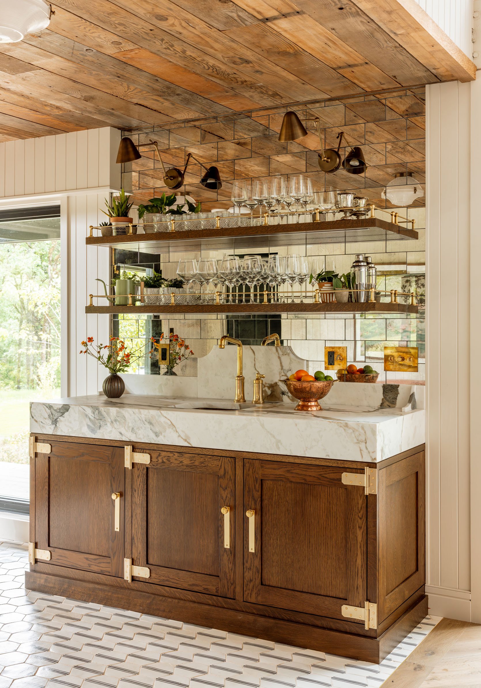 That bar is so incredibly designed – the chunkiness of the cabinet in that dark wood is classic, but unexpected, and the huge hinges and hardware pop. Not to mention the stop counter and backsplash. They spared no expense. I love how the mirrored tile backsplash reflects the warmth of the ceiling.