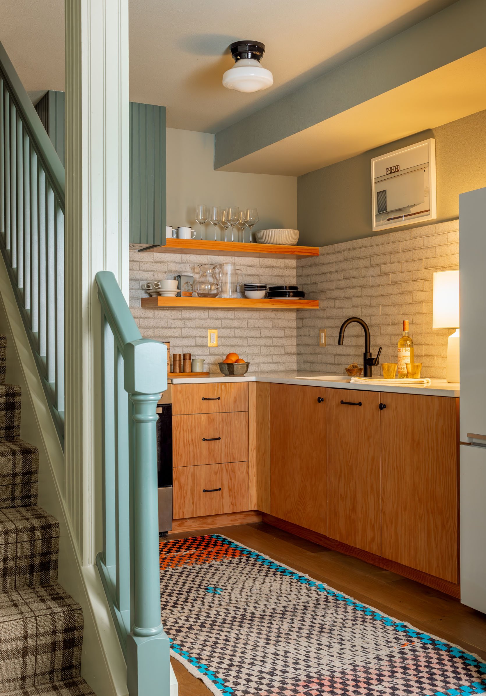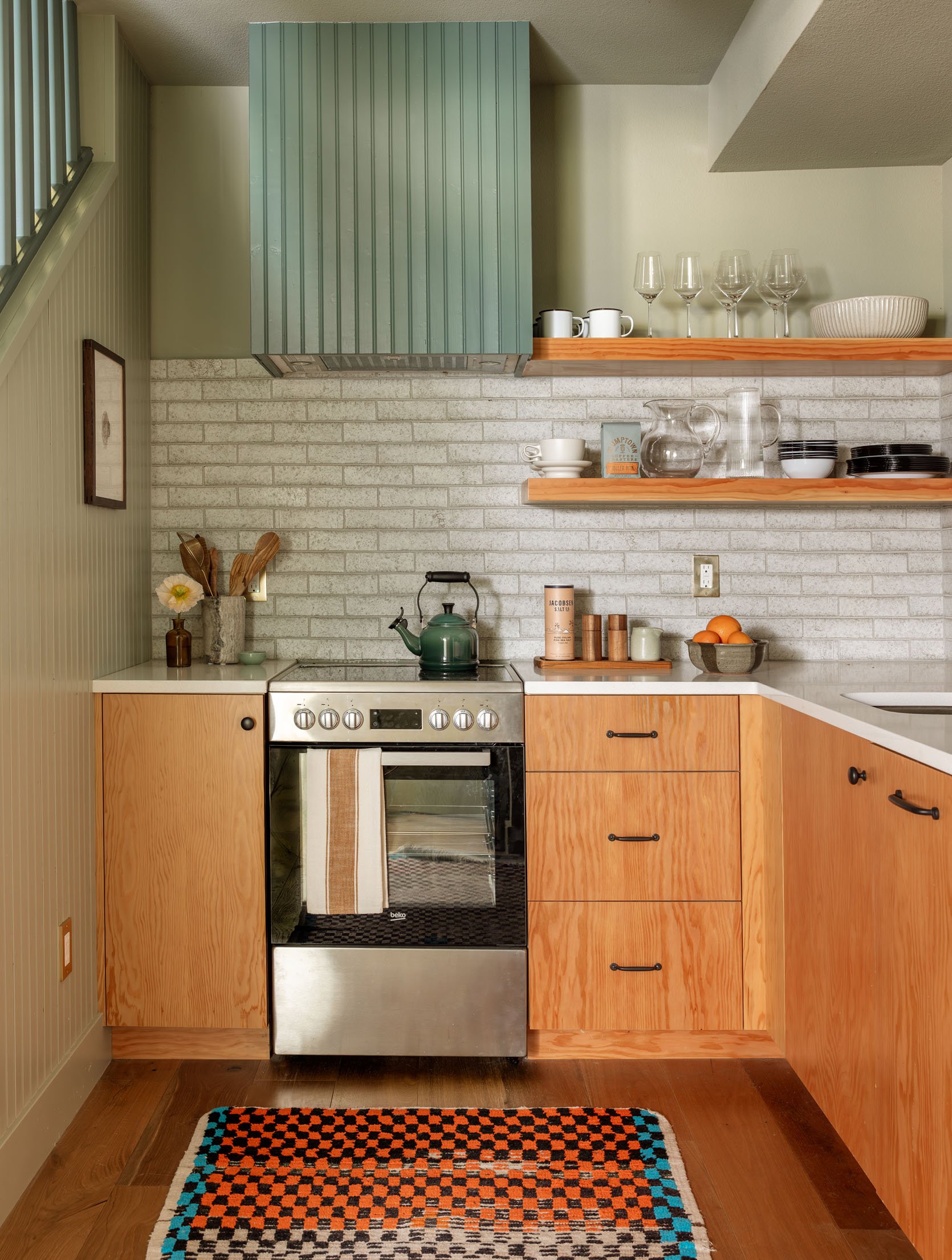 We loved the paneled hood with the brick and plywood cabinets. More of a youthful, apartment vibe, but highly functional and well planned.
