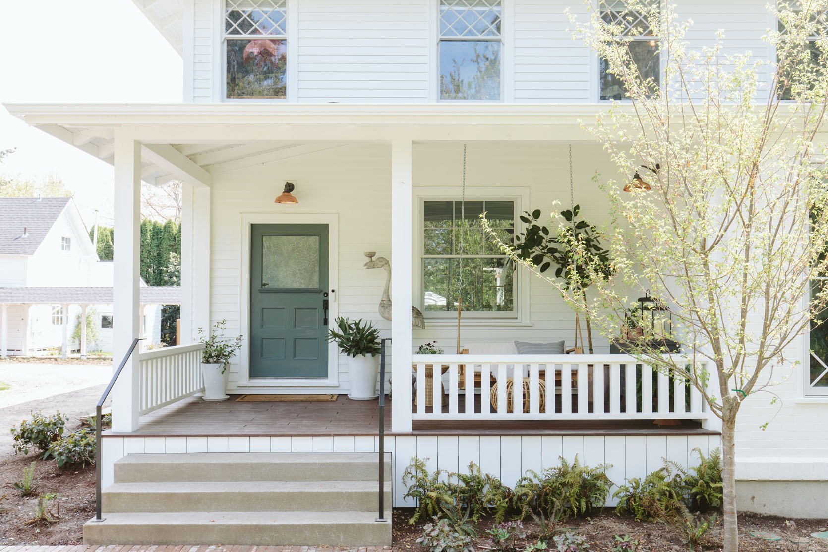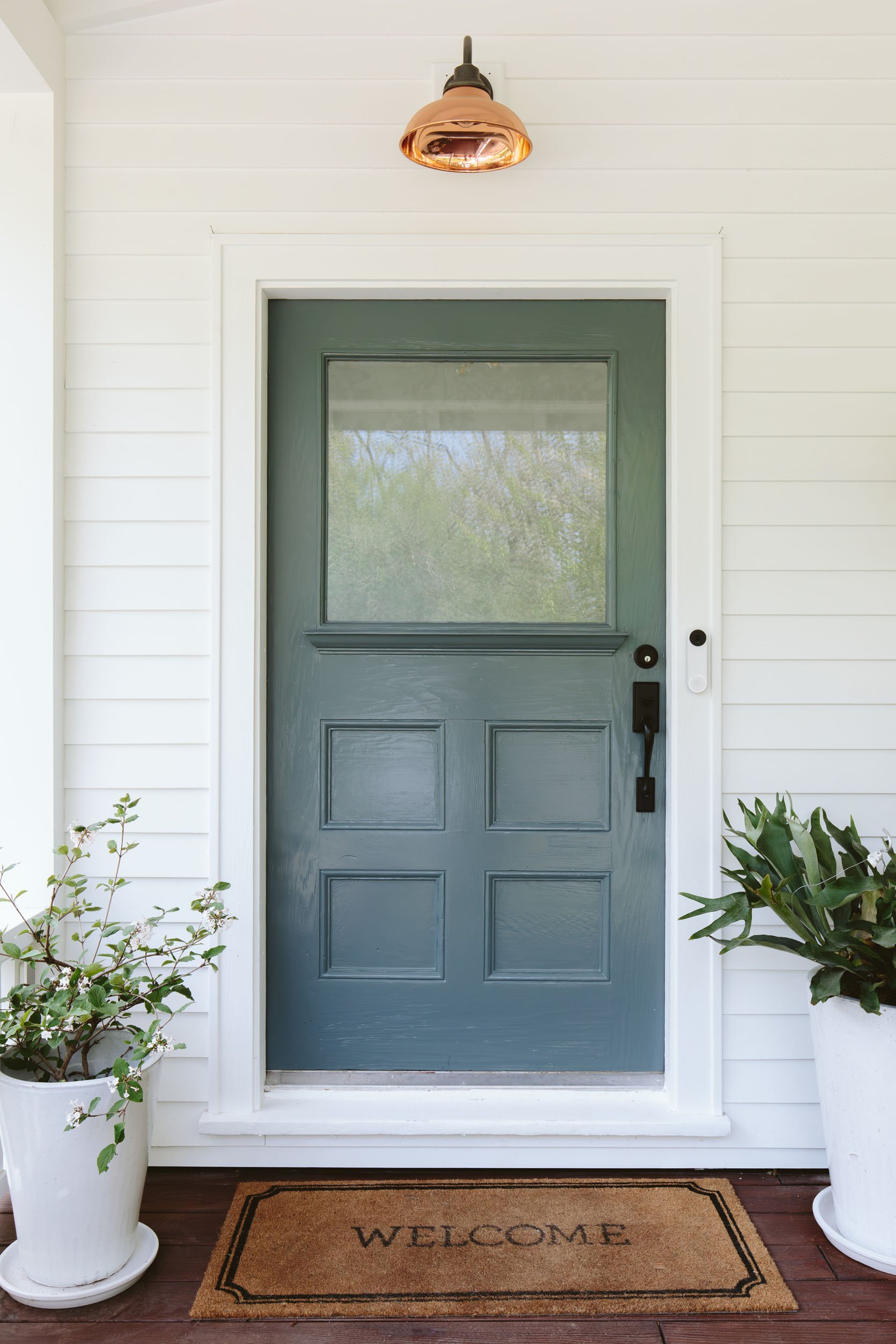 For the exterior, I wanted a bright happy white and while honestly probably many of them could have worked, I love how Pure White SW 7005 pops (especially now that the landscaping is totally grown in – I need new photos!). It just feels really happy and nearly impossible for a color to not look good against it. I love how the copper and blue of the doors all pop against it and that it feels really really happy.