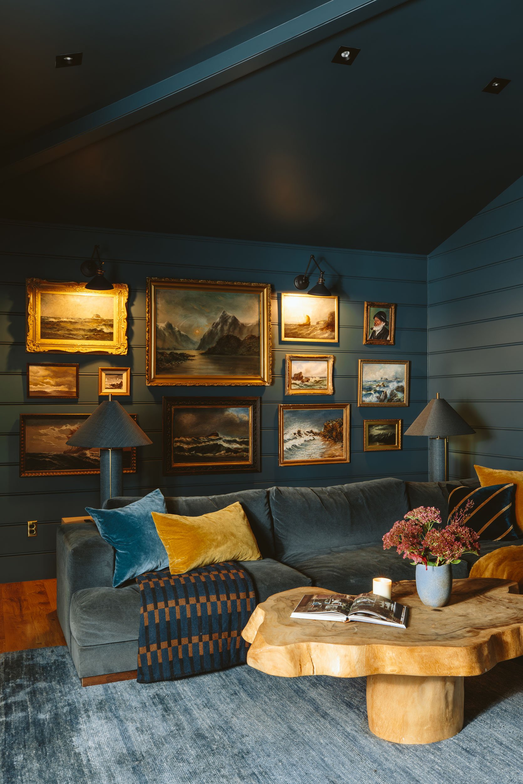 After first painting this room a pretty gray color that just didn’t work, I obsessed over making sure this color was perfect with the sofa and vibe, and I’m happy to say it is. This color, Still Water SW 6223 (Emerald® Interior Acrylic Latex in satin) is a very very dark teal, and in this room (that is really dark with only one indirect light source) it has the perfect amount of undertones to still read as a color (not just sucking the light and reading black). But fair warning, in a room with a lot of natural light this color will look VERY bold and more like a bright but dark Teal. It’s moody in here because it’s dark with low light. But I wouldn’t put it in a larger bright room unless you want a really saturated and bold colorful room.