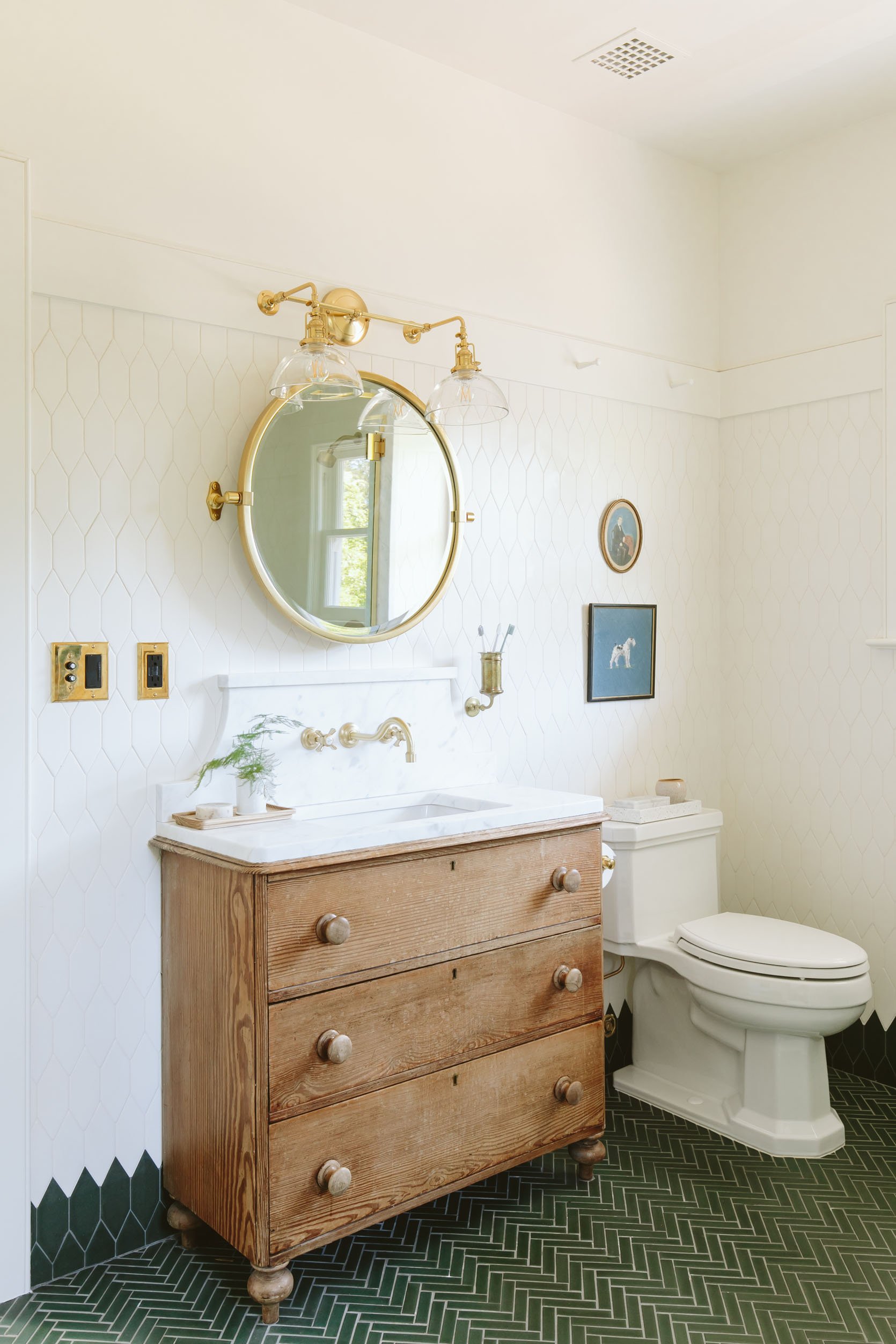 Dew Drop SW 9641 was the first paint color that we saw and I gasped in delight. It is SUCH a pretty light blue/green that is so subtle but doesn’t read as a pastel at all. It picked up all the tones of the tile and complemented the wood so well. It feels fresh, bright, and airy. I wouldn’t put this color in a room without a lot of natural light because it might look flat. I find that lighter colors like this need the natural light to bring out the pigment.