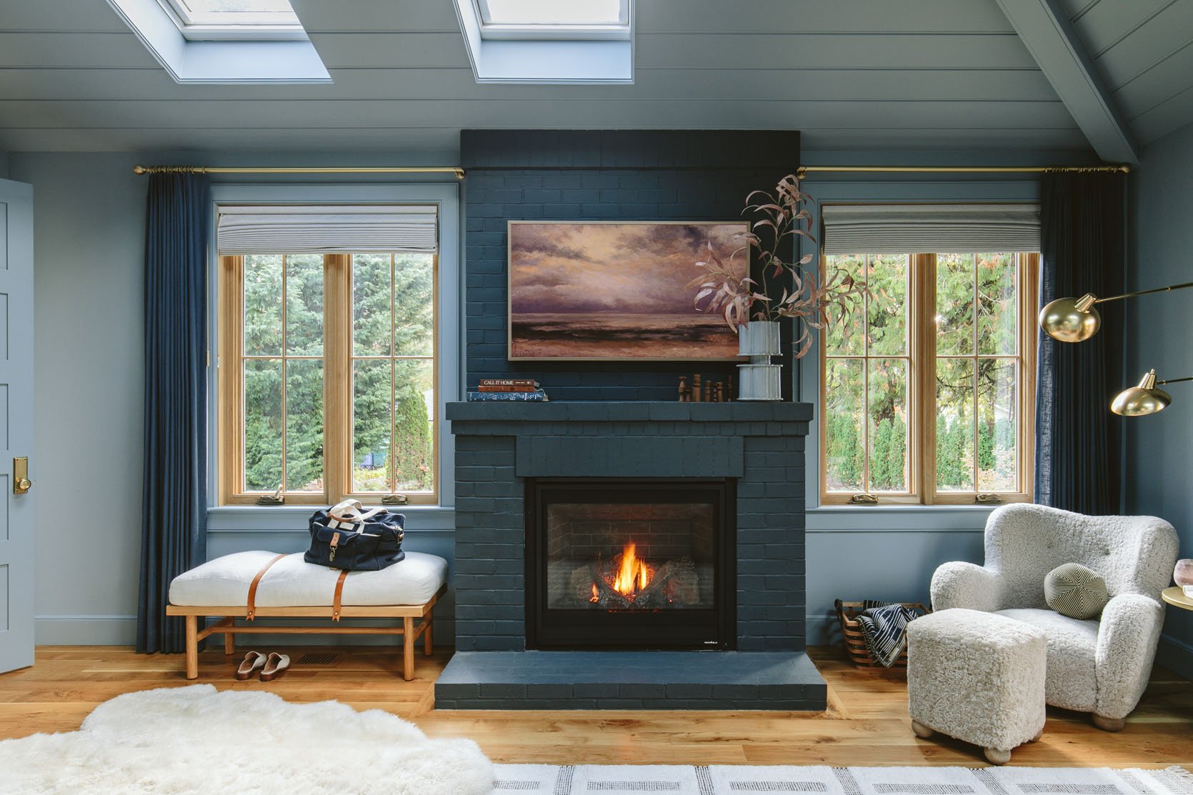We painted our fireplace Big Dipper SW 9645 (which I’ve used before). This is an almost black that would definitely read as black in a low light situation, but is such a pretty dark navy with a lot of green in it here. We love it.