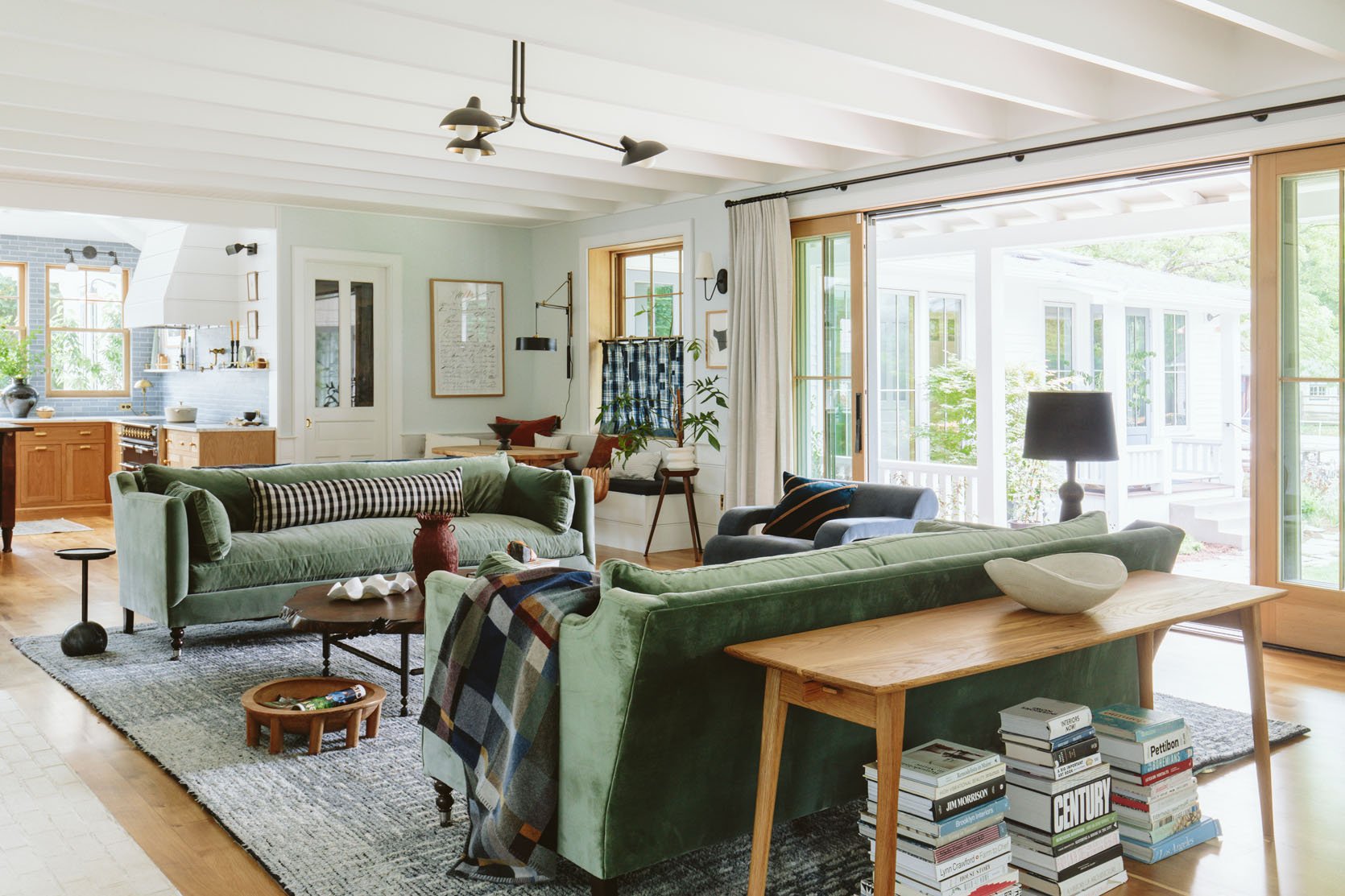 Idea! Would you consider shifting just the drywall in the living room to a very light sage-y green? Basically pick up the green in the sofas (but much lighter), as well as the green in the dining room chairs, and your plants both outside and in. Full disclosure that green is my fave, but I can see that being a great way to add some subtle contrast to the blues in the kitchen, TV room and stairs, but also “speak to” to the other greens in the rooms you see from the LR.