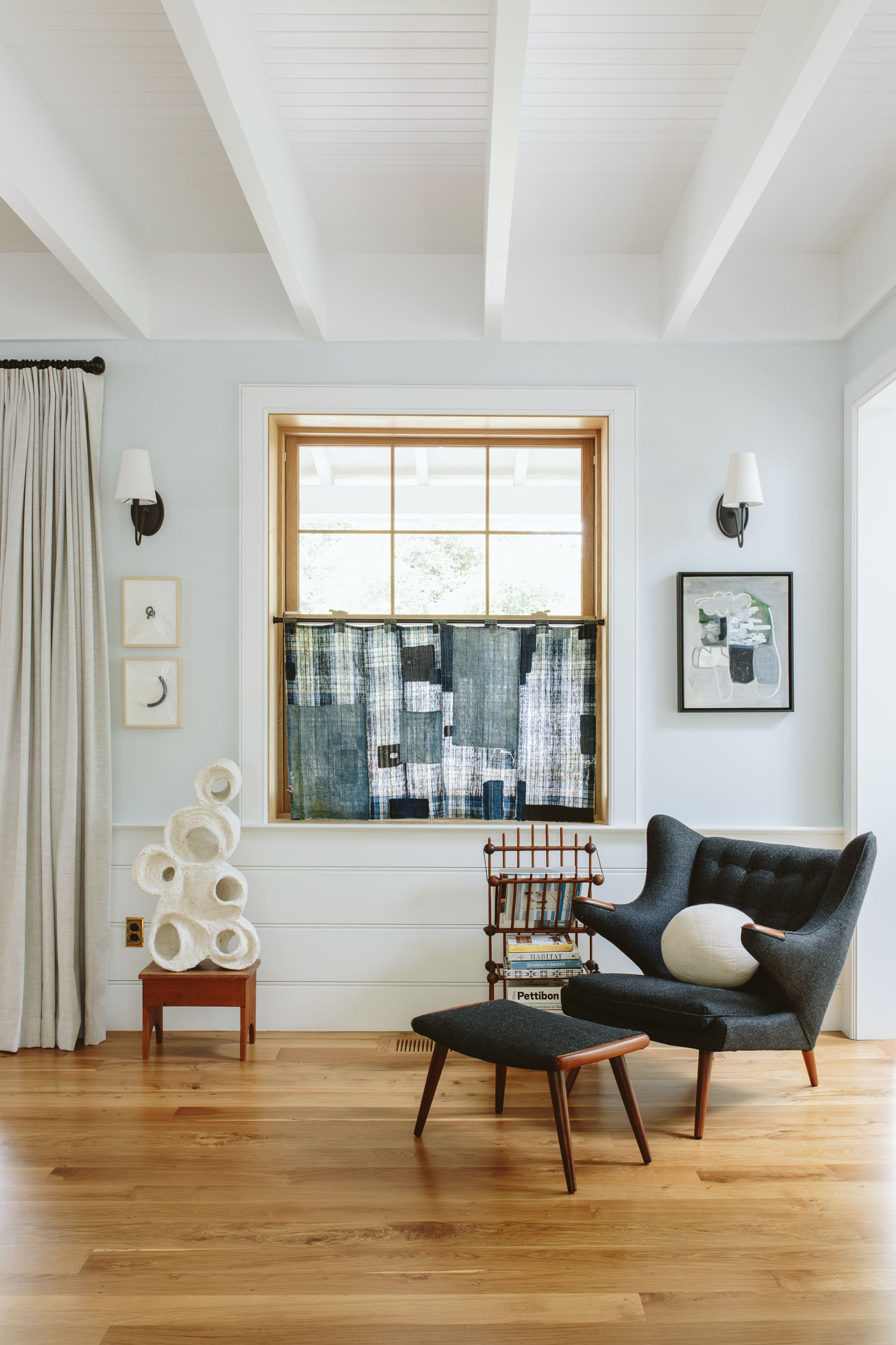 For now, we painted the drywall using Emerald® Designer Edition™ Interior Latex in flat, (which is far less expensive to paint than wood) a light blue/gray/green called Mantra SW 9631 from the Designer Color Collection and it adds such a nice tone that works with everything we have. Sometimes it looks light blue, sometimes Robin’s egg, sometimes gray. Definitely check in on your lighting during multiple times of the day and on multiple walls. I love the designer series because the paint colors are super nuanced (and I love the confidence knowing that it’s been vetted by a designer).